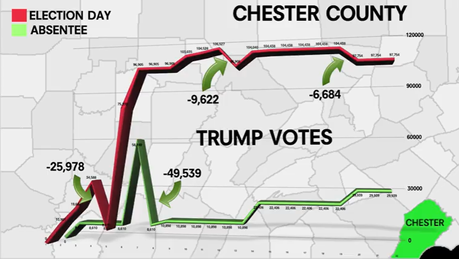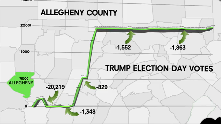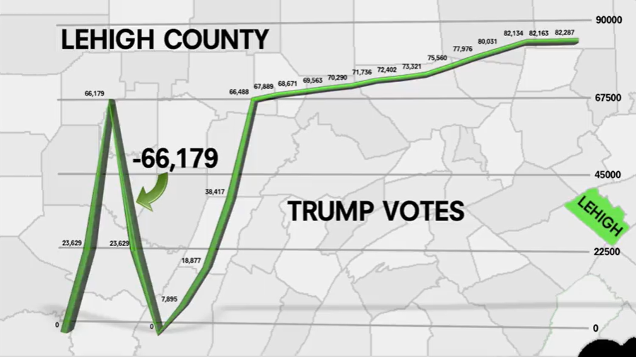 Údaje o průběhu voleb v časových řadách ukazují, že se počet hlasů pro Donalda Trumpa v různých okresech v mnoha časových bodech začal snižovat. Při sčítání hlasů může docházet pouze ke stagnaci nebo nárůstu hlasů, v žádném bodě není možné, aby kandidátům hlasy ubývaly.