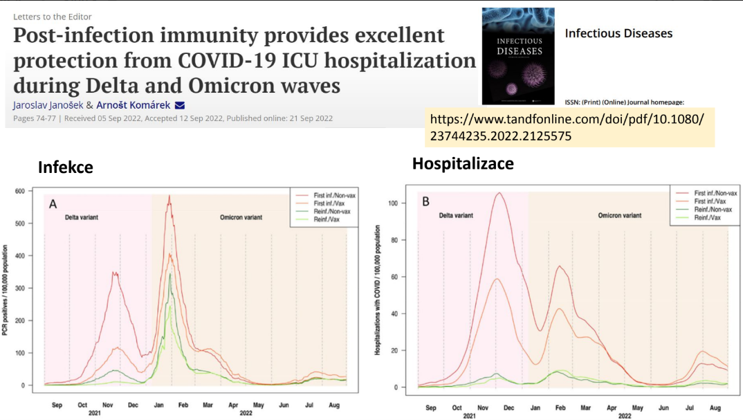 Např. v katarské studii sledovali výskyt infekcí variantami delta a omikron ve skupinách osob očkovaných a neočkovaných po prodělané infekci (2). Neočkovaných osob onemocnělo ve sledovaném období o polovinu méně než očkovaných. Ochranný efekt imunity po prodělané infekci byl potvrzen i na českých datech, kdy naprostou většinu hospitalizovaných osob v roce 2021 tvořili lidé, kteří infekci prodělávali poprvé (3). Opakovaně nakažených a vážně nemocných bylo hospitalizováno minimum.