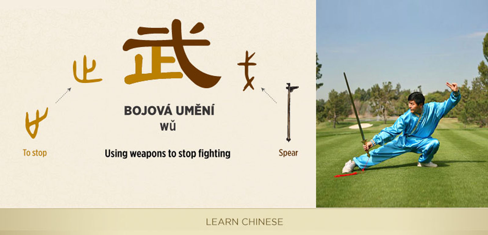 Při rozebrání čínského znaku wu (武), označujícího bojová umění (wu-šu), pravou stranu znaku tvoří symbol 戈 (ke), který reprezentuje zbraň, zatímco levá složka znaku – 止 (č’) – znamená zastavit. To znamená, že skutečná definice bojových umění je zastavit násilí, válčení či konflikt, zatímco bojujete za harmonii a klid.