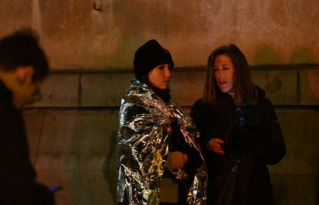 Mladá žena s termopřikrývkou první pomoci u Univerzity Karlovy v centru Prahy, 21. prosince 2023. (Foto: MICHAL CIZEK / AFP via Getty Images)