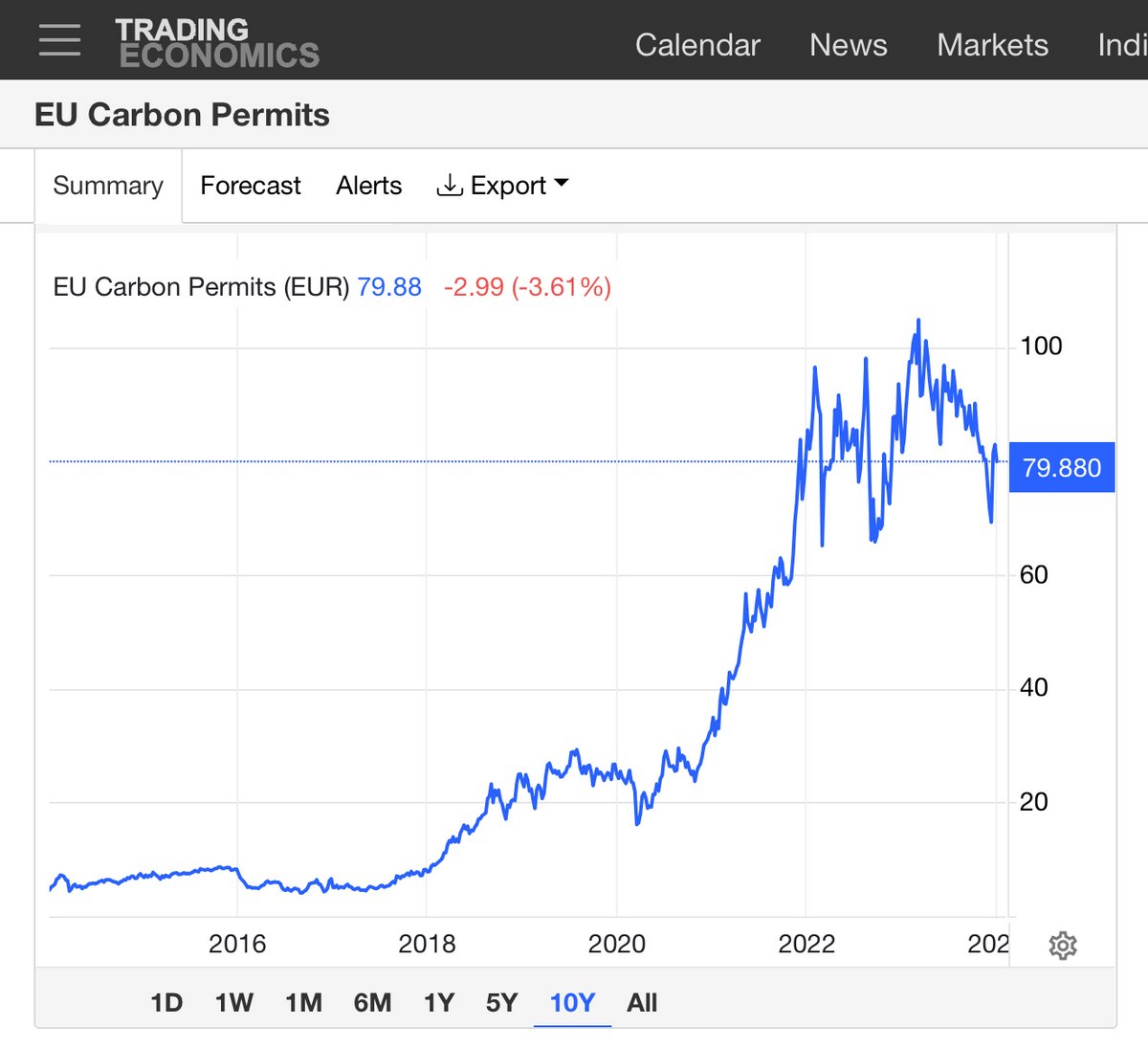 Ceny povolenek stoupají výrazněji od roku 2019, kdy byl v EU schválen Green Deal (za ČR jej odsouhlasil tehdejší premiér Babiš), přičemž vrcholu dosáhly v roce 2022 (kdy se za českého předsednictví současného premiéra Fialy prosadil legislativní balíček Fit for 55).