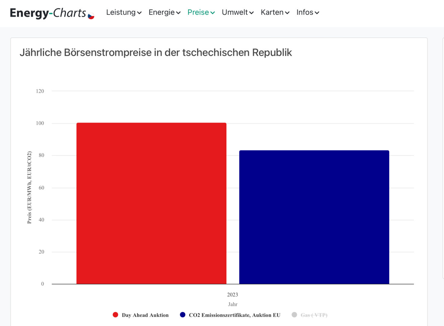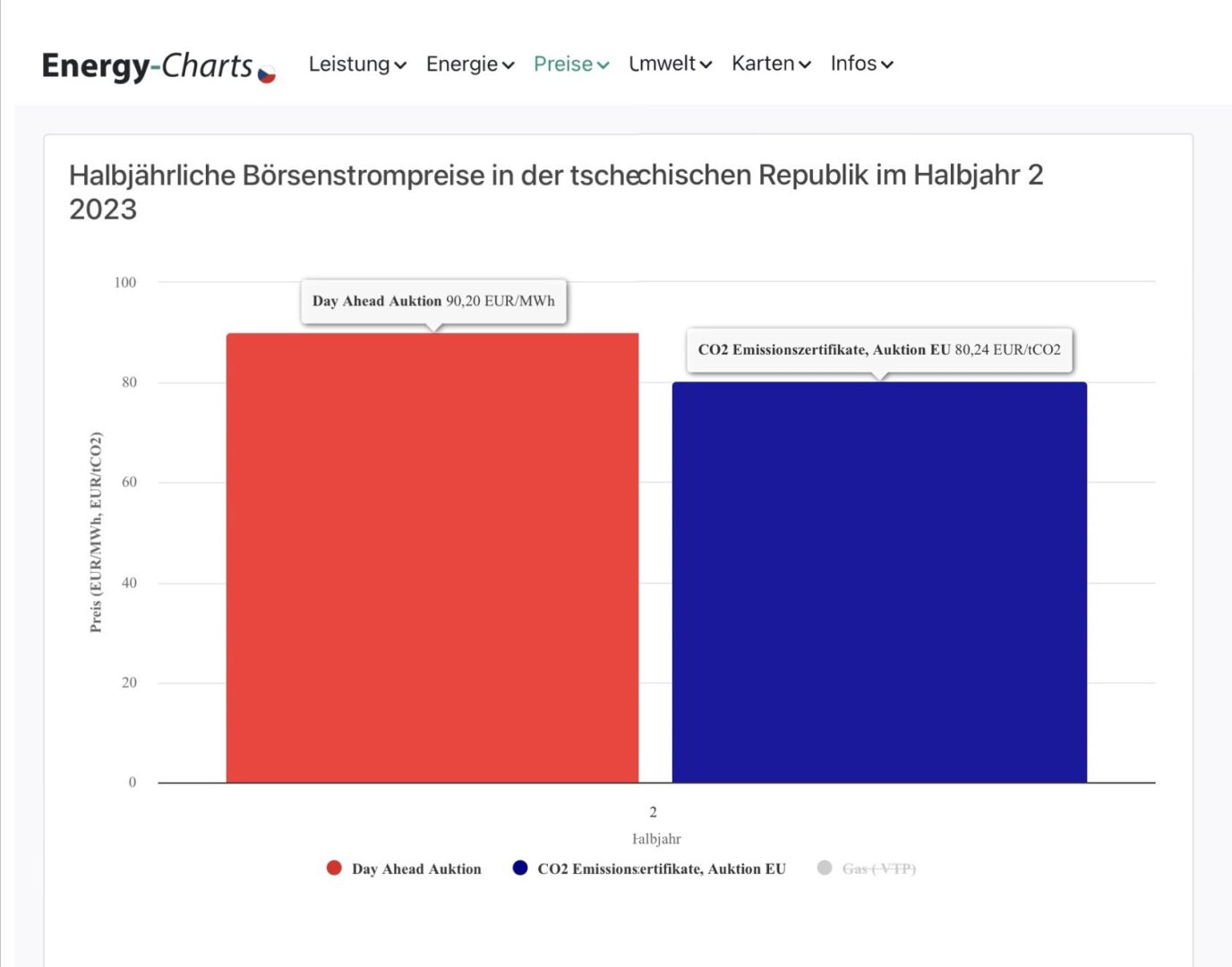 V grafech níže můžete vidět, že v roce 2023 byl rozdíl mezi průměrnou cenou jedné MWh elektřiny na burze a cenou povolenky na jednu tunu CO2 pouhých 17 eur. Ve druhé polovině roku už to bylo jen kolem 10 eur. Cena elektřiny je určována především obchodováním na burze, v případě Česka na burze v německém Lipsku.