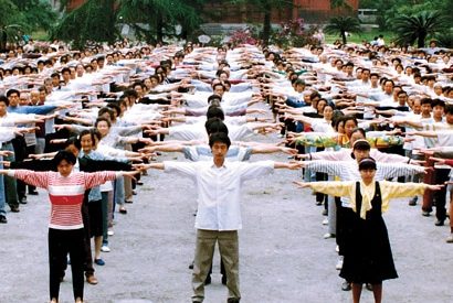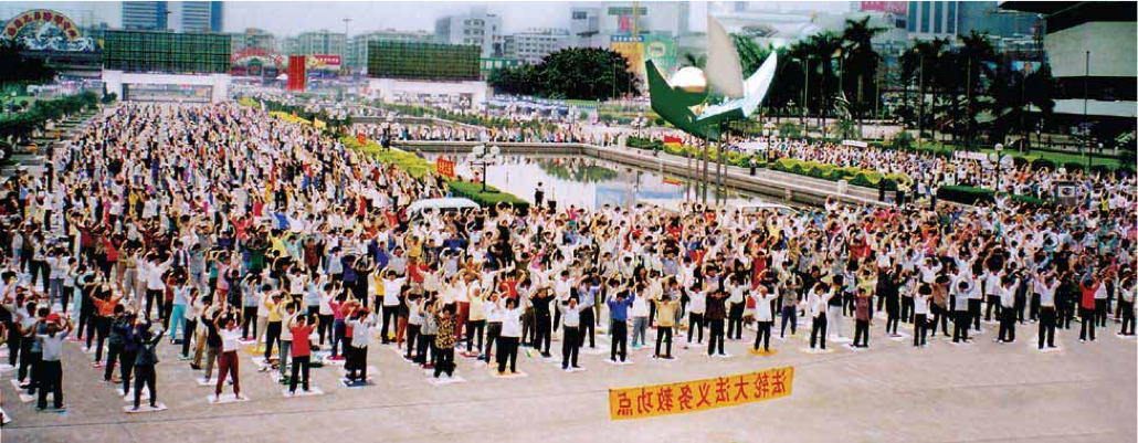 Na fotografii výše je autentický záběr z náměstí Nebeského klidu v Pekingu, kam se po 20. červenci 1999 vydávali mnozí příznivci Falun Gongu protestovat se zdviženými transparenty proti vládním represím, které považovali za neopodstatněné.