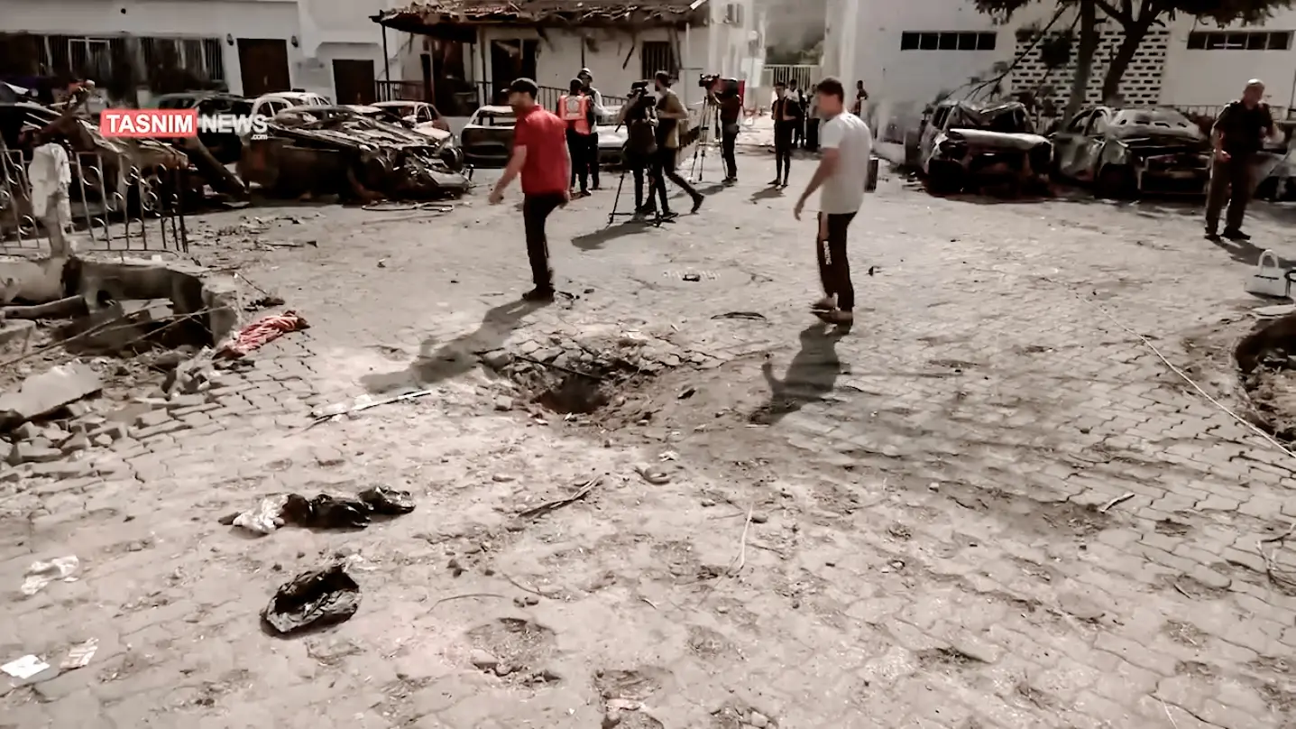 Snímek z videozáznamu ukazuje místo, kde projektil zasáhl nádvoří nemocnice Al Ahlí Arab ve městě Gaza. (Tasnim News Agency / CC BY 4.0)