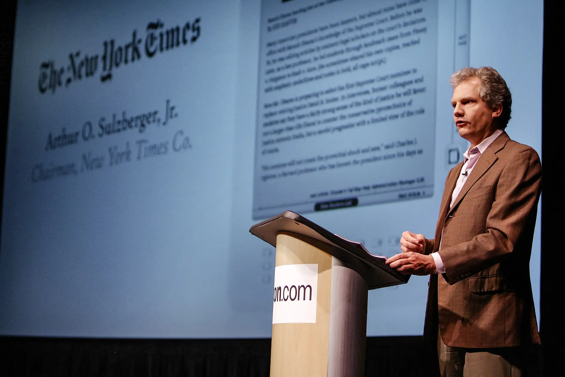 Foto: Arthur Sulzberger Jr., vydavatel deníku New York Times, hovoří na tiskové konferenci v Michael Schimmel Center for the Arts na Pace University v New Yorku 6. května 2009. (Spencer Platt / Getty Images)