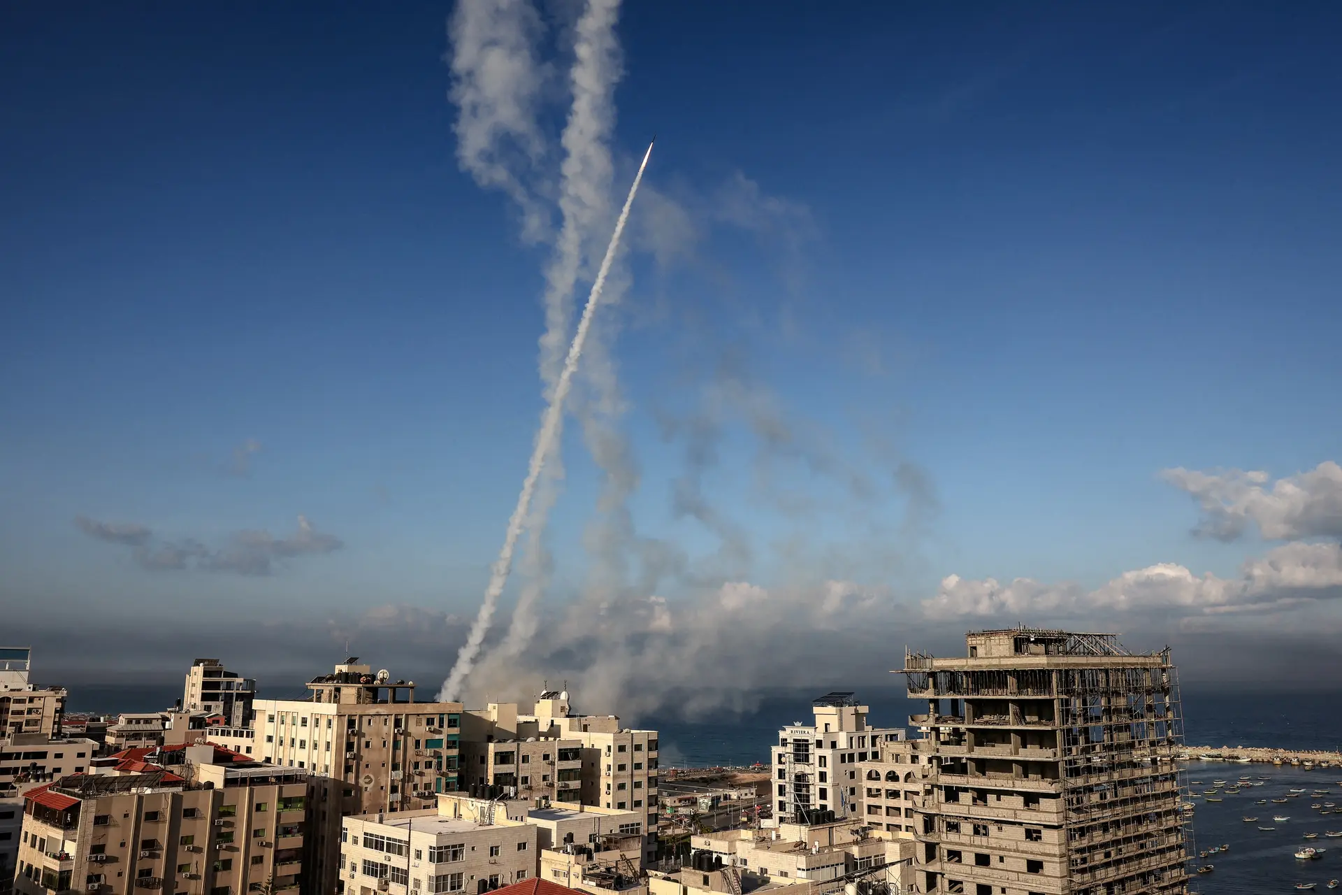 Foto: Z blokovaného pásma Gazy byly 7. října 2023 vypáleny desítky raket směrem na Izrael. (Mohammed Abed / AFP prostřednictvím Getty Images)