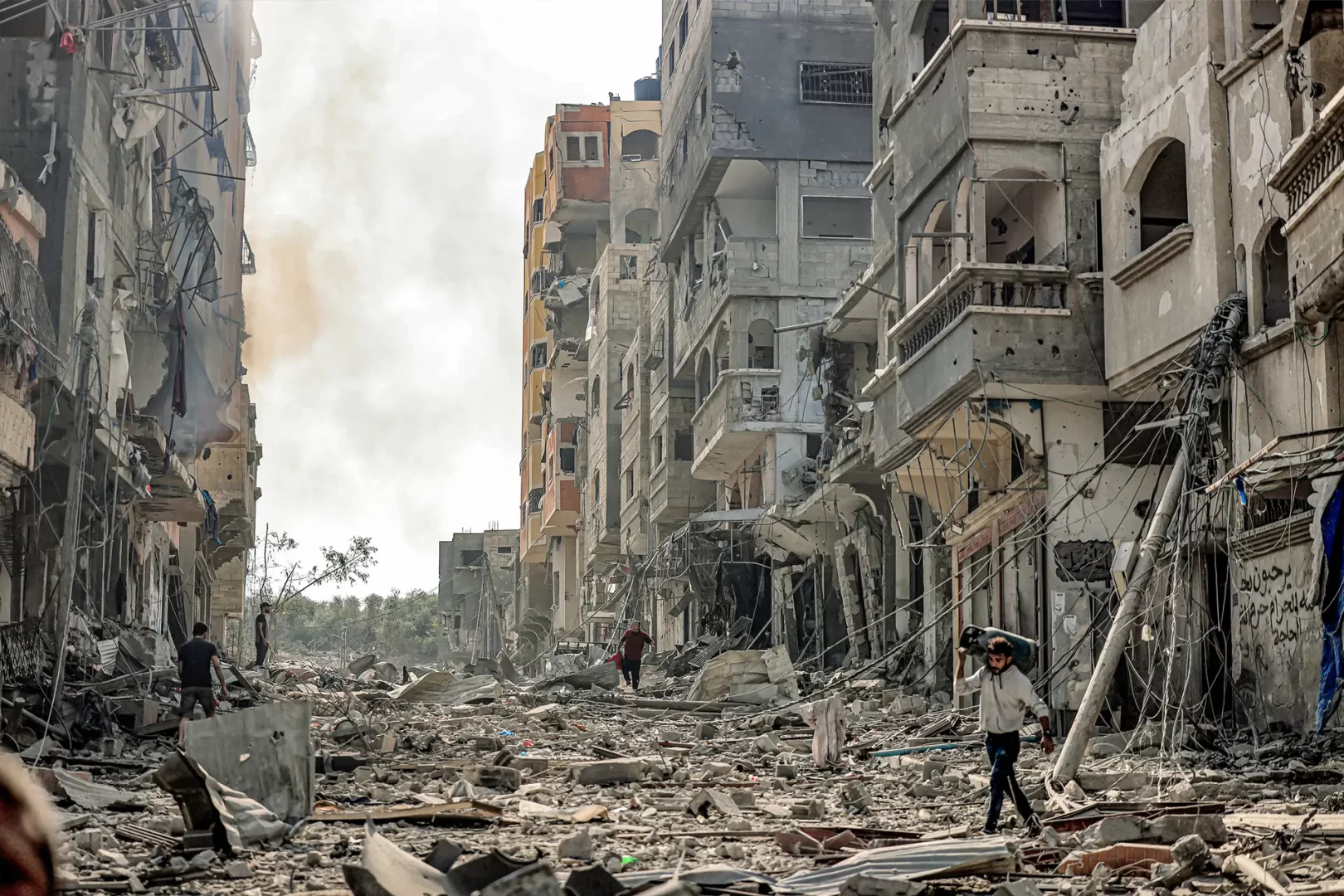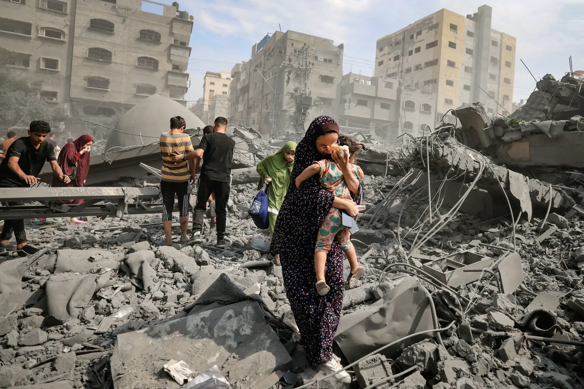 Foto: (Nahoře) Trosky z útoků během války Izraele s Hamásem pokrývají ulici v táboře Džabalíja pro palestinské uprchlíky ve městě Gaza 11. října 2023. (Dole) Palestinci evakuují oblast po izraelském leteckém útoku na mešitu al-Sousi ve městě Gaza 9. října 2023. (Mahmud Hams / AFP prostřednictvím Getty Images)