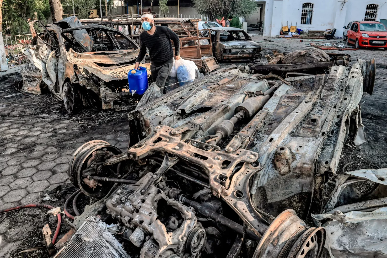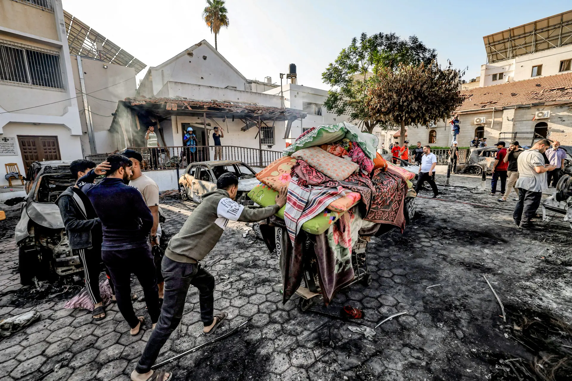 Foto: (Nahoře) Letecký pohled na komplex, v němž se nachází nemocnice Al Ahlí Arab ve městě Gaza, po nočním výbuchu 18. října 2023. (Vlevo dole) Muž tlačí vozík se zachráněnými matracemi, polštáři a prostěradly v Gaze 18. října 2023. (Dole vpravo) Zničená vozidla po výbuchu poblíž nemocnice Al Ahli Arab v Gaza 18. října 2023. (Shadi Al-Tabatibi / AFP prostřednictvím Getty Images)