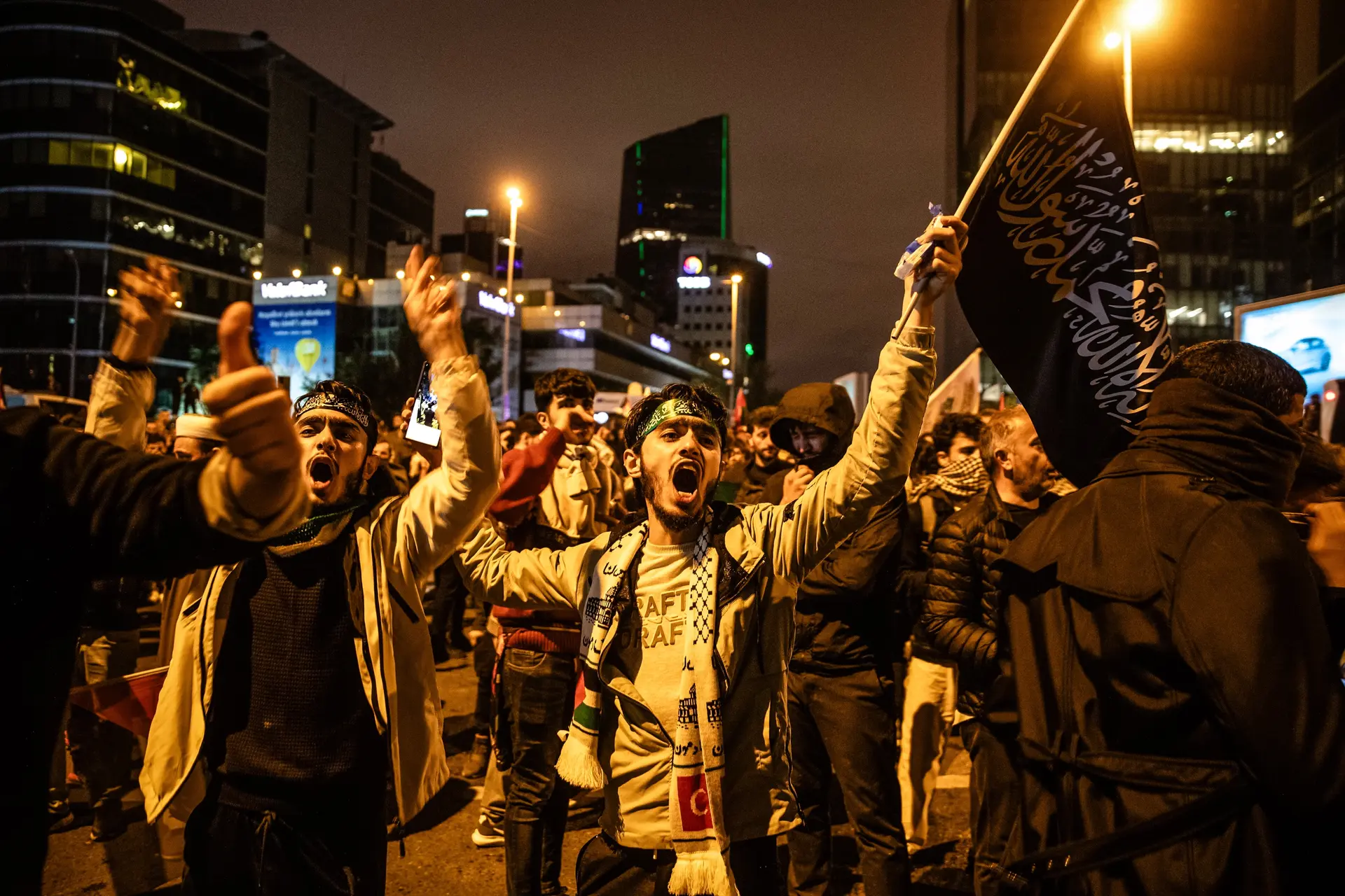 Foto: Protestující demonstrují před izraelským konzulátem v Istanbulu po výbuchu poblíž nemocnice ve Gaza, 17. října 2023. (Burak Kara / Getty Images)