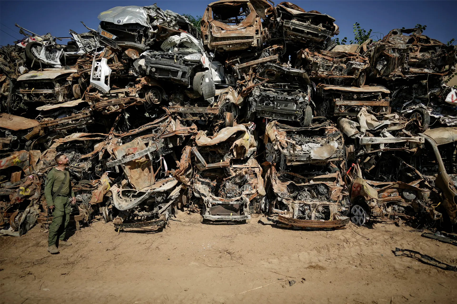 Foto: Voják prohledává auta v areálu více než 1 000 zničených vozidel po útocích Hamásu ze 7. října v izraelském městě Tkuma 16. listopadu 2023. (Mohammed Abed / AFP prostřednictvím Getty Images)