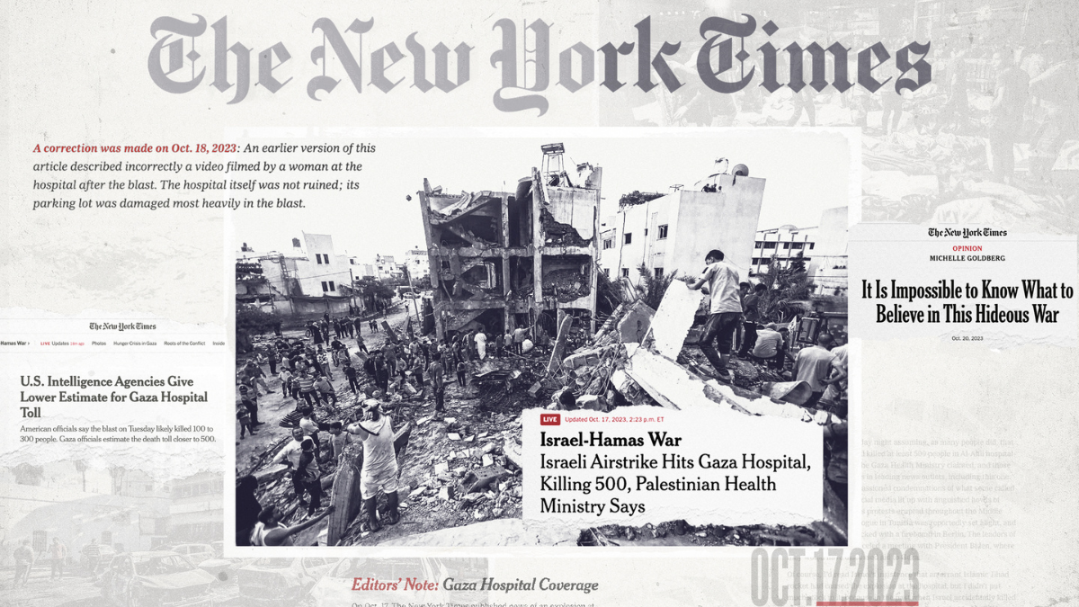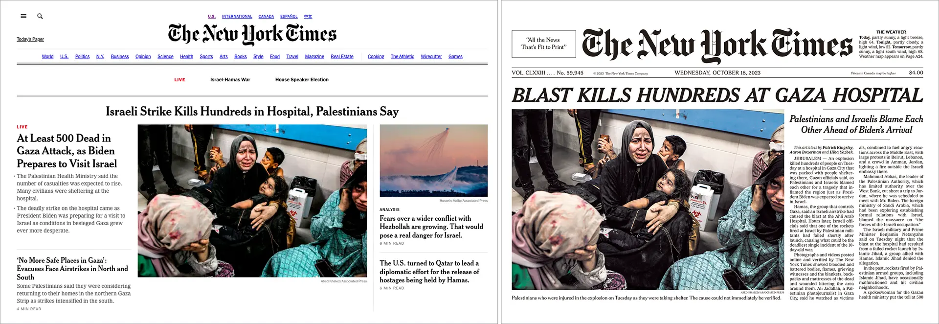 V tištěném vydání NY Times z 18. října je v úvodu uvedena zpráva o výbuchu ze 17. října. „Výbuch zabil stovky lidí v nemocnici v Gaze,“ hlásá titulek. Oprava na konci této reportáže se však objevuje až na straně A12, kde článek na titulní straně přeskočí do svého závěru.