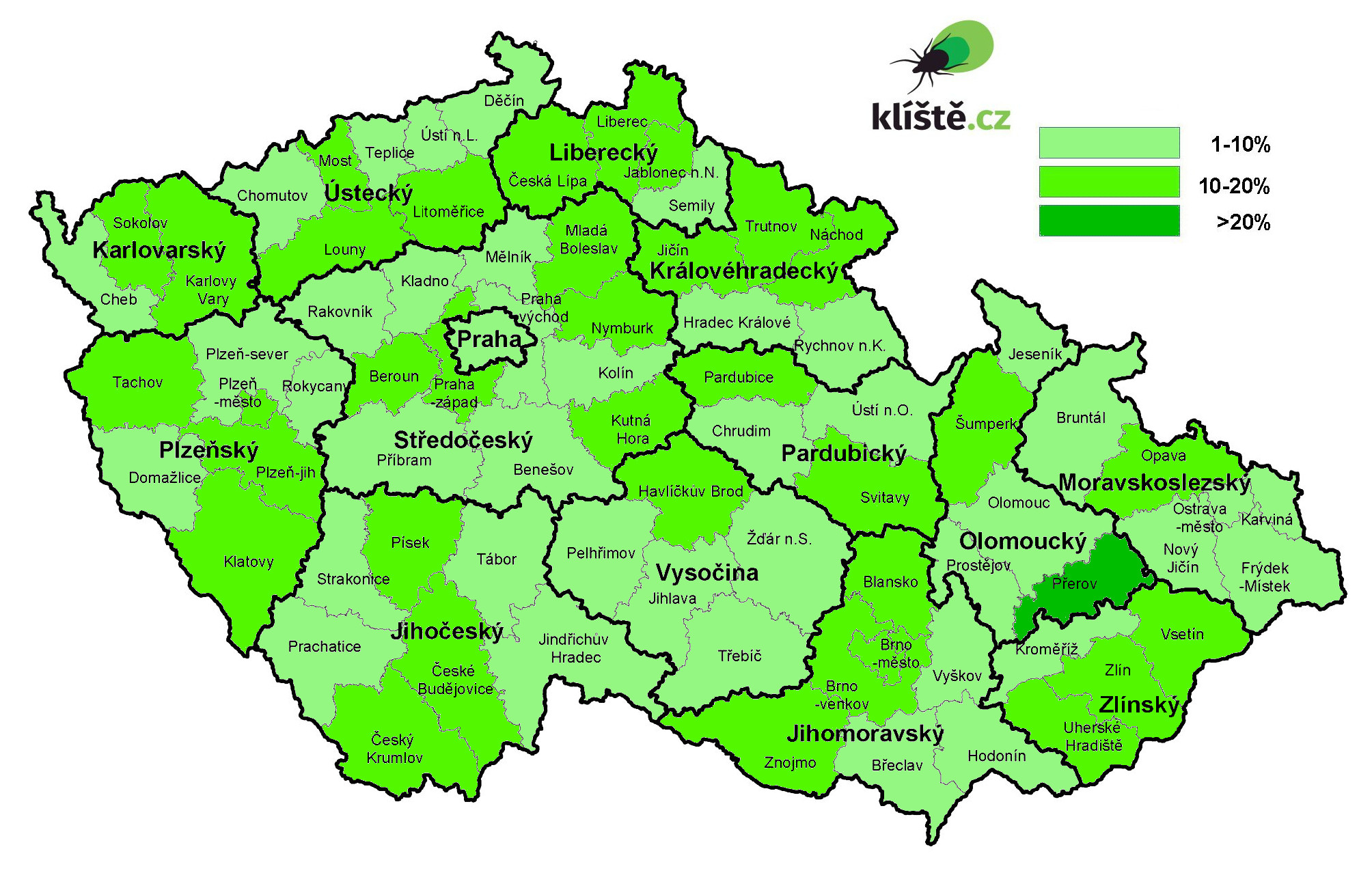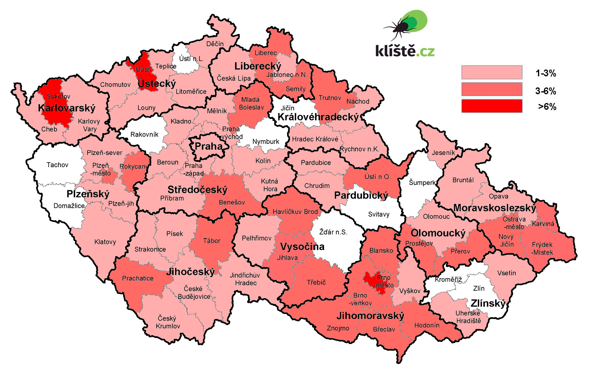 Mapa výskytu infikovaných klíšťat v ČR přenášejících boreliózu. (s laskavým svolením kliste.cz)