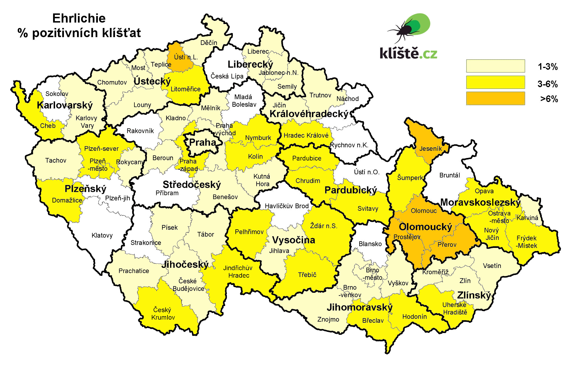 Mapa výskytu infikovaných klíšťat v ČR přenášejících ehrlichiózu. (s laskavým svolením kliste.cz)