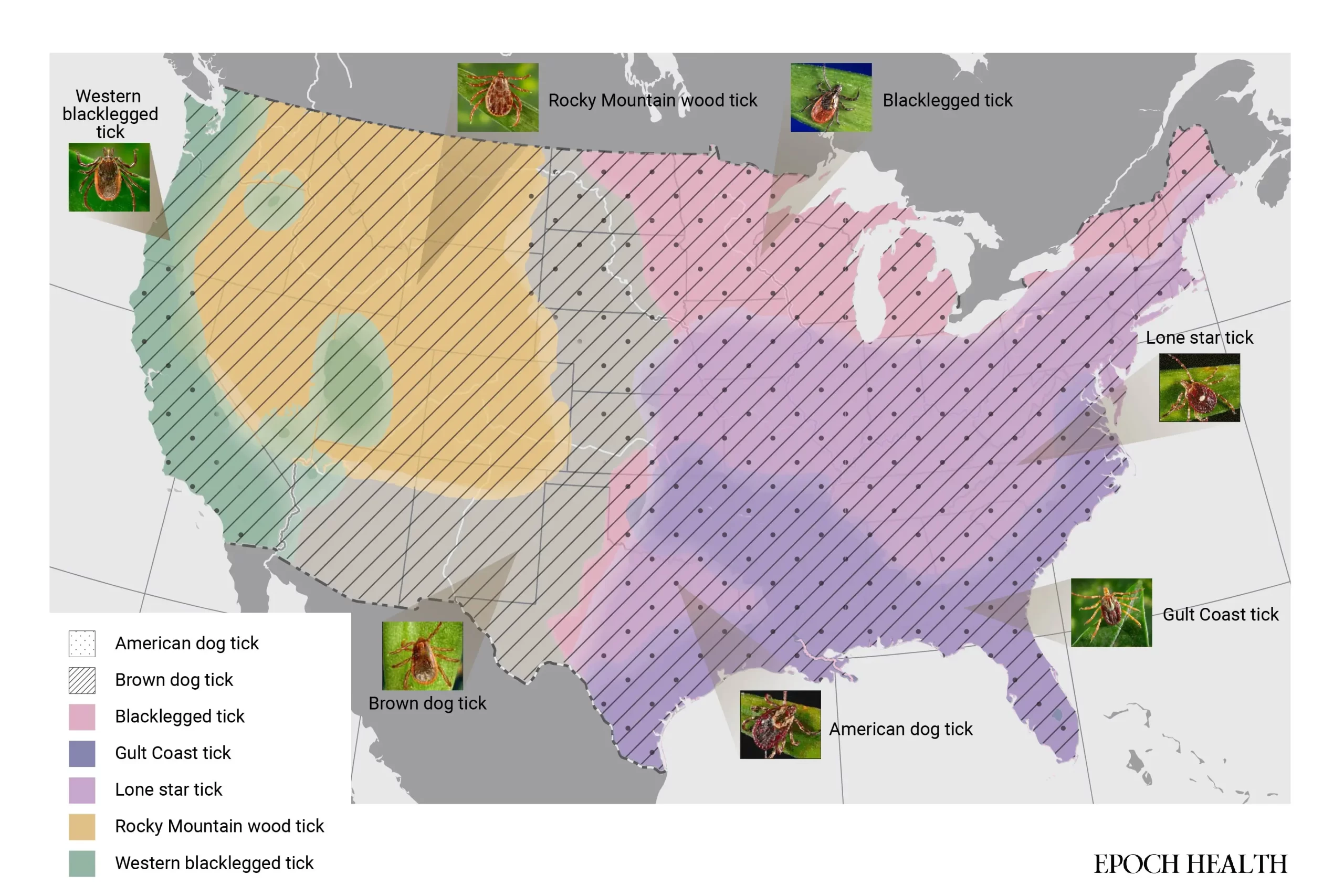 Rozšíření různých druhů klíšťat ve Spojených státech podle amerického Centra pro kontrolu a prevenci nemocí (CDC). (Epoch Times)