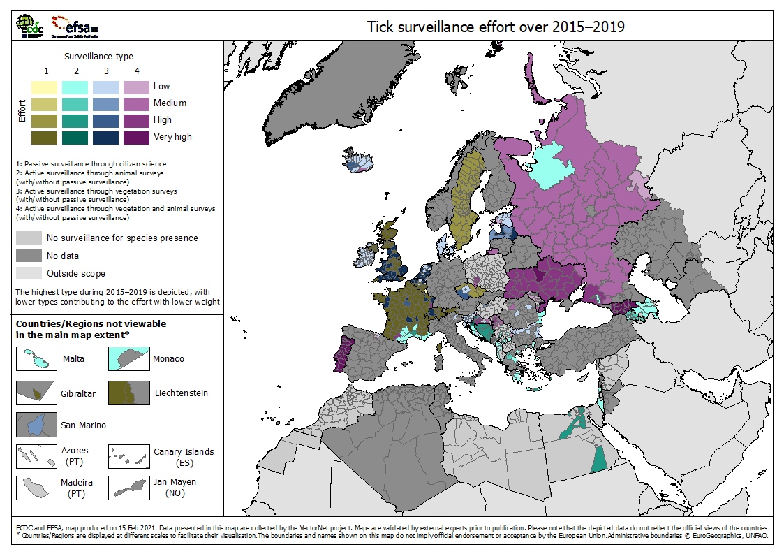 Mapa „intenzity pozorování klíšťat v letech 2015–2019“ zobrazuje intenzitu pozorování v jednotlivých správních oblastech podle nejvyššího počtu typů pozorování. (European Centre for Disease Prevention and Control)