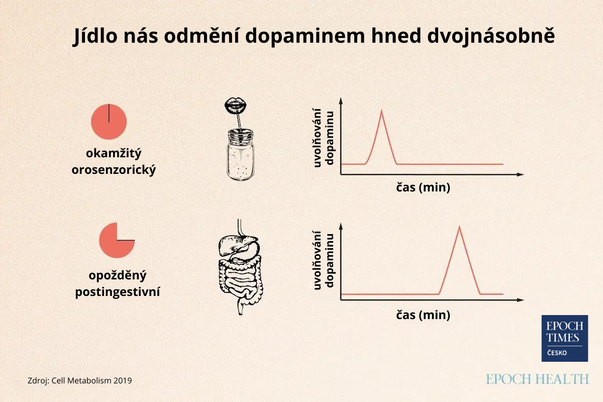 Výsledky ukázaly, že jídlo způsobuje v našem mozku dvojí uvolňování dopaminu.