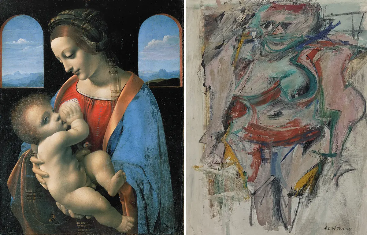 (L) „Madonna Litta“, asi 1490, Leonardo da Vinci. Muzeum Ermitáž, Petrohrad. (Public Domain)(R) „Stojící žena – růžová“, 1954-55, Willem de Kooning. Olej na kartonu. Jedno z několika de Kooningových abstraktně expresionistických děl zobrazujících ženu. FrankTang/CCBY-SA 4.0