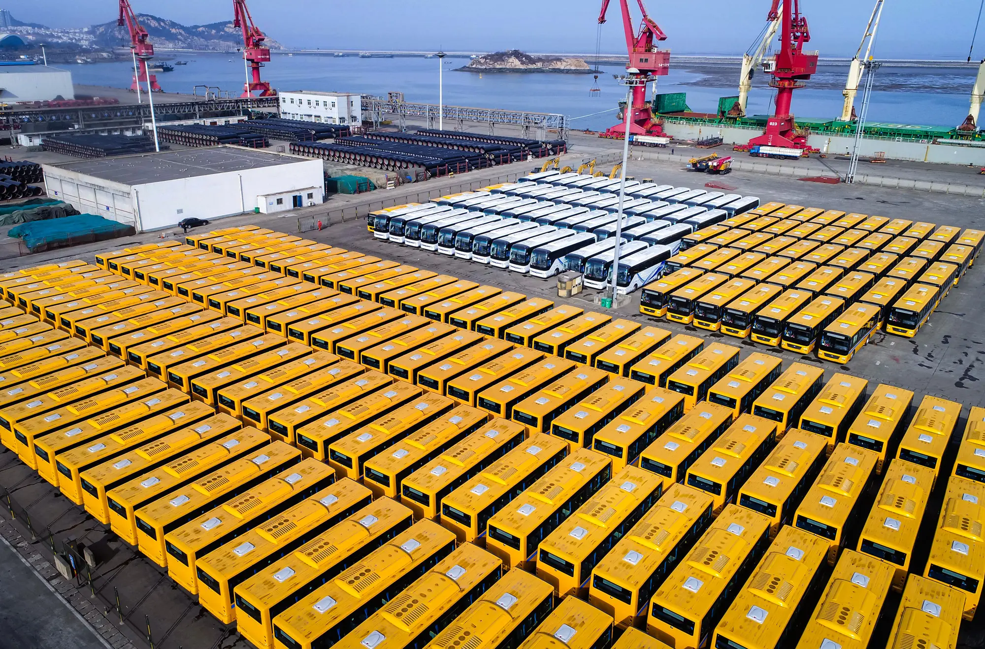 (Nahoře) Elektromobily BYD čekají na naložení pro export v přístavu Yantai v provincii Shandong na východě Číny dne 10. ledna 2024. (Dole) Více než 500 autobusů čeká na vývoz do Afriky v Lianyungangu v čínské provincii Jiangsu dne 2. ledna 2018. (STR / AFP prostřednictvím Getty Images, Wang Jianmin / VCG prostřednictvím Getty Images).