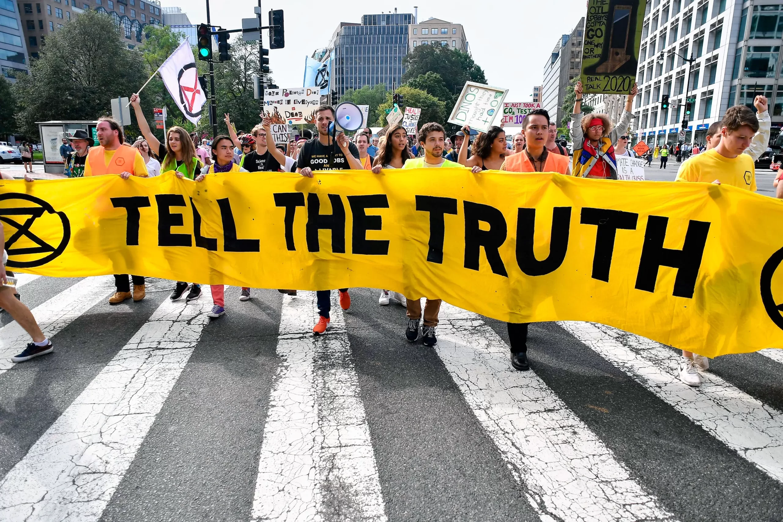 Environmentální aktivisté držící banner s nápisem „ŘEKNI PRAVDU“ blokují křižovatku během protestu v rámci globálního týdne akce za klima ve Washingtonu dne 23. září 2019. (Mandel Ngan / AFP prostřednictvím Getty Images)