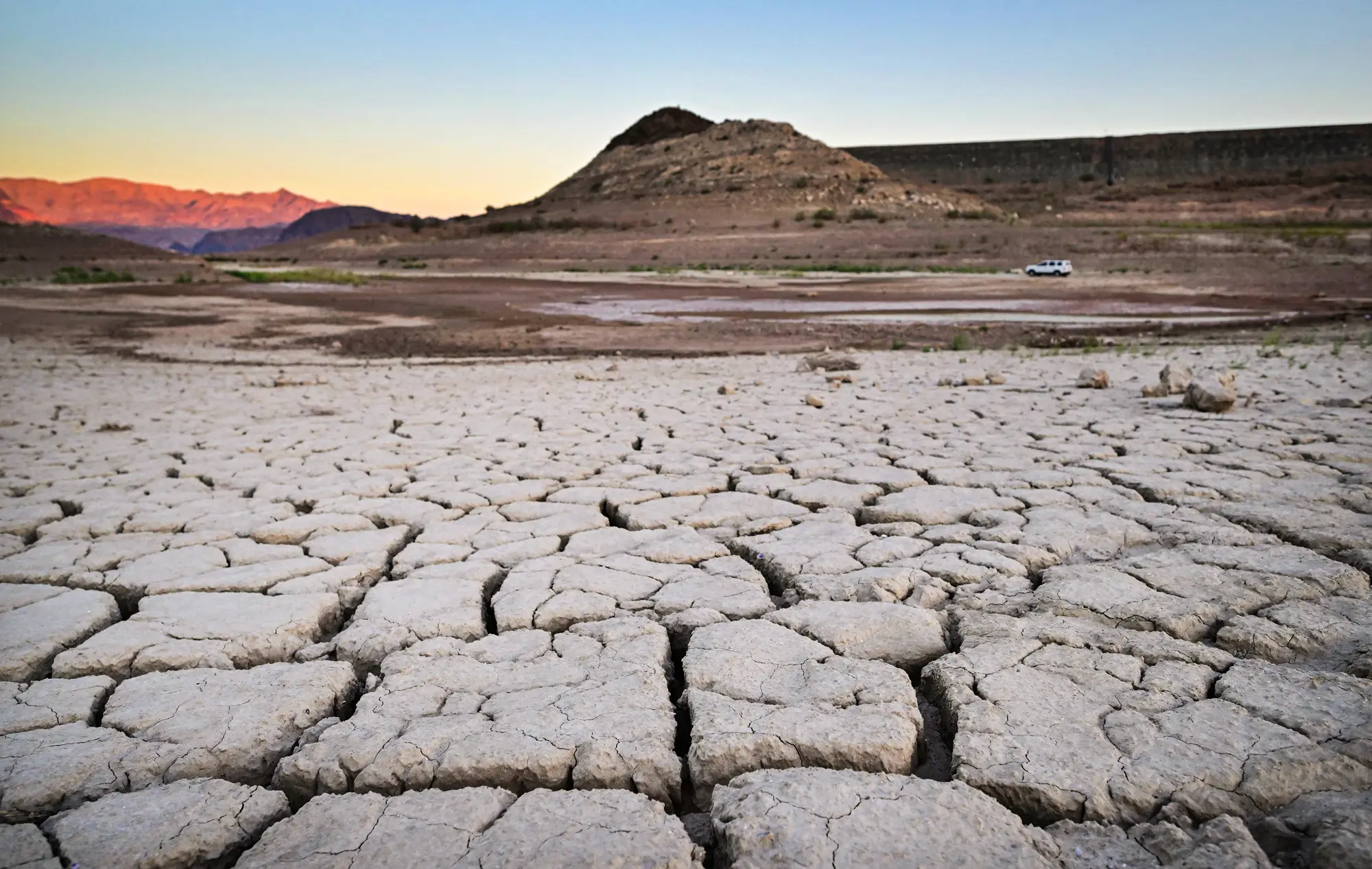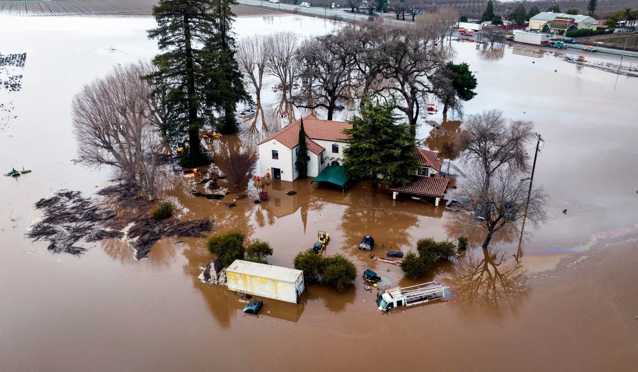 (Nahoře) Letecký pohled na zatopený dům částečně pod vodou v Gilroy, Kalifornie, 9. ledna 2023. (Dole) Vozidlo projíždí kolem suchého, popraskaného dna jezera v oblasti Lake Mead postižené suchem v Boulder City, Nevada, 15. září 2022. (Josh Edelson / AFP via Getty Images, Frederic J. Brown / AFP prostřednictvím Getty Images)