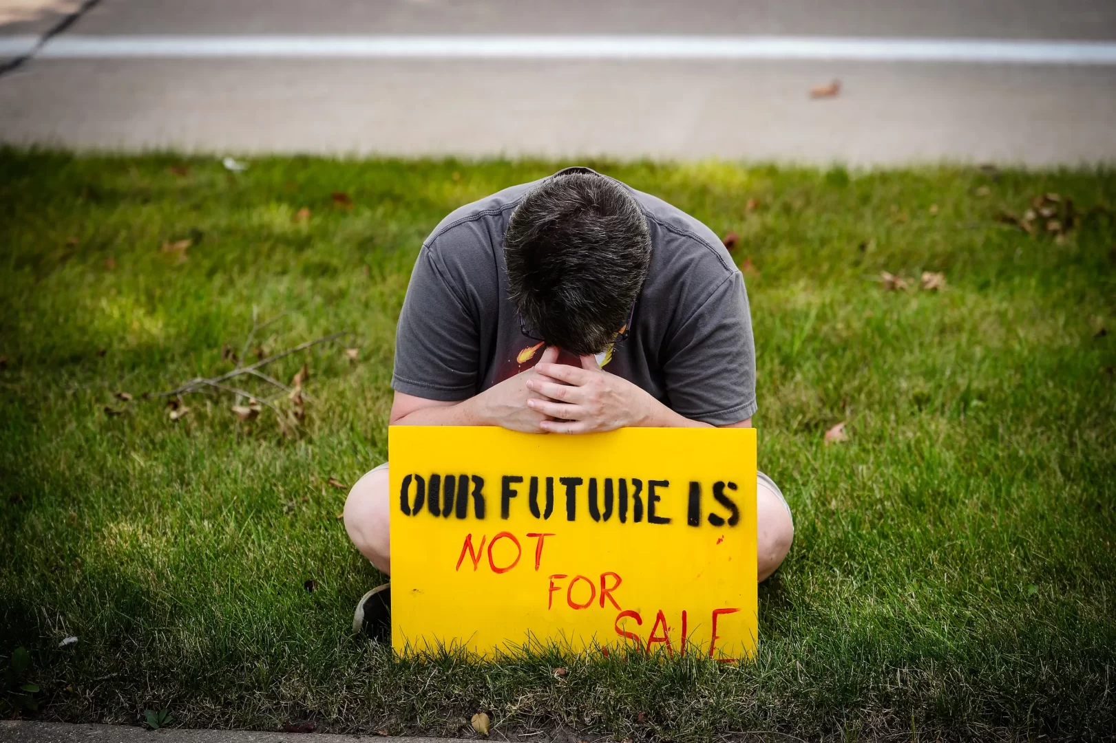 Demonstrant drží transparent s nápisem „NAŠE BUDOUCNOST NENÍ NA PRODEJ“ na shromáždění #SealTheDeal pro klima, pracovní místa, péči a spravedlnost v Champaign, Illinois, dne 19. srpna 2021. (Daniel Boczarski / Getty Images pro Green New Deal Network)