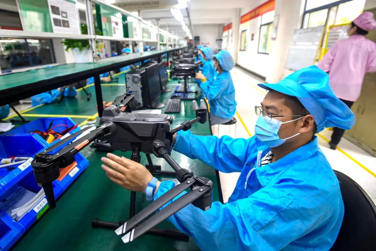 Pracovníci vyrábějí drony v továrně ve Wuhanu v provincii Hubei v Číně, 13. dubna 2023. (STR / AFP přes Getty Images)