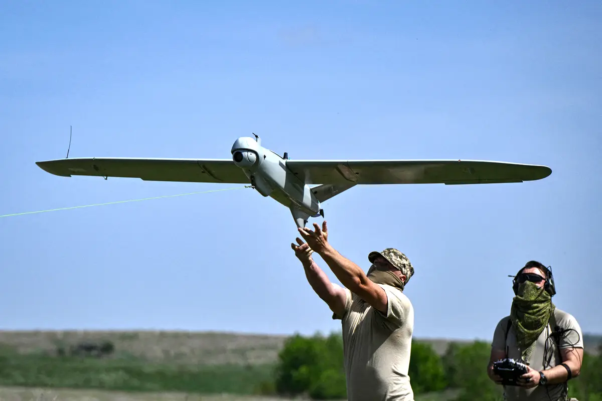 Ukrajinští vojáci 22. brigády vypustějí 27. dubna 2024 poblíž Chasiv Yar průzkumný bezpilotní letoun Leleka. (Genya Savilov / AFP přes Getty Images)