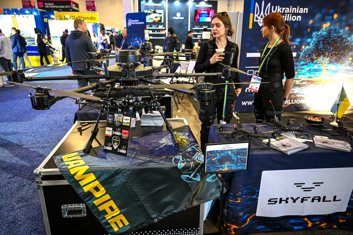 Dron Skyfall Vampire a dron SHRIKE FPV z Ukrajiny jsou vystaveny v ukrajinském technologickém pavilonu na Consumer Electronics Show v Las Vegas, 7. ledna 2025. (Patrick T. Fallon / AFP prostřednictvím Getty Images)