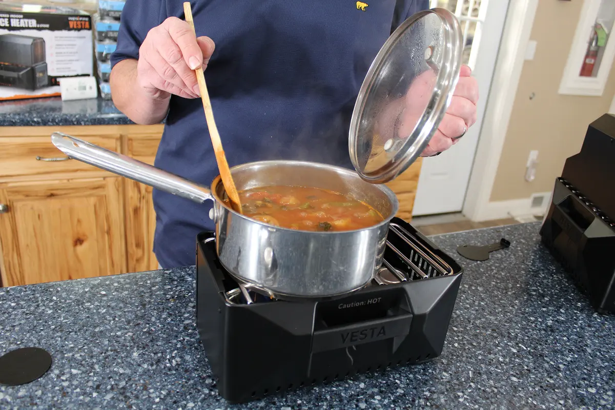 Když je zásoba jídla zajištěna, nyní je čas připravit se na vaření. Pro Kylene to znamená vytáhnout kompaktní vařič a kamínka v jednom od firmy Vesta. Toto skladné zařízení je poháněno patentovaným palivem v plechovkách a je vhodné i do interiéru s dostatečnou ventilací. Palivo se navíc dá bezpečně skladovat uvnitř.