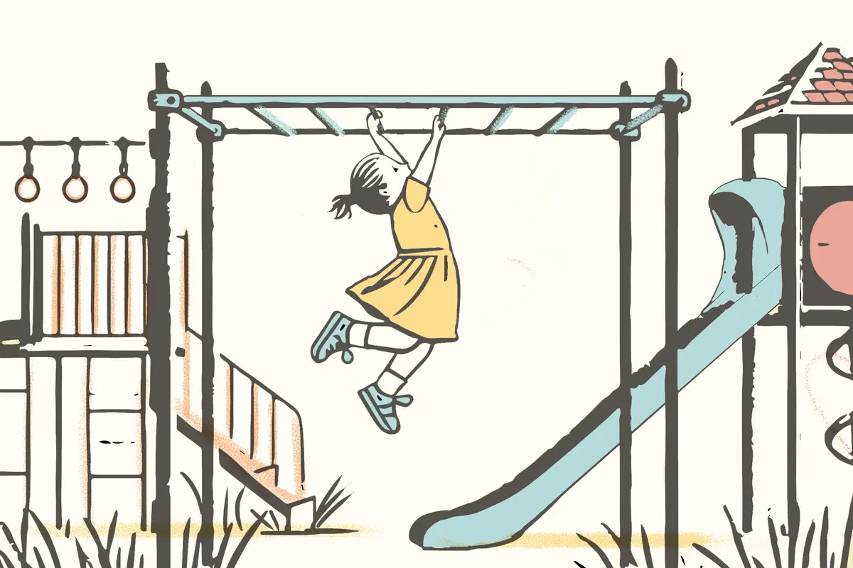 Harris navrhuje představit si dětské hřiště. „Představte si malé dítě, které se houpe na hrazdě. Mnoho z nás žije jako toto dítě – uprostřed, neschopni se posunout vpřed nebo pustit.”