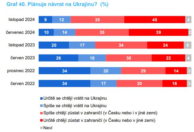 V horizontu následujících dvou let se plánovalo vrátit na Ukrajinu 21 % uprchlíků. Naopak zůstat v Česku nebo jinde v zahraničí zamýšlely tři čtvrtiny z nich, nicméně jen 40 % je o tom přesvědčeno silně.