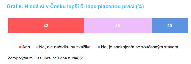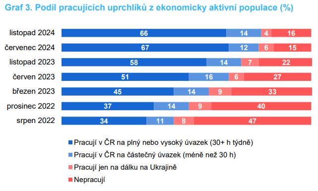 Osmdesát procent z potenciální pracovní síly ukrajinských uprchlíků má v České republice práci. 66 % pracuje více než 30 hodin týdně, tedy v podstatě na plný pracovní úvazek, a 14 % pracuje méně než 30 hodin týdně. Malá část (4 %) pracuje na dálku na Ukrajině a 16 % potenciálně ekonomicky aktivních v době výzkumu nepracovalo.