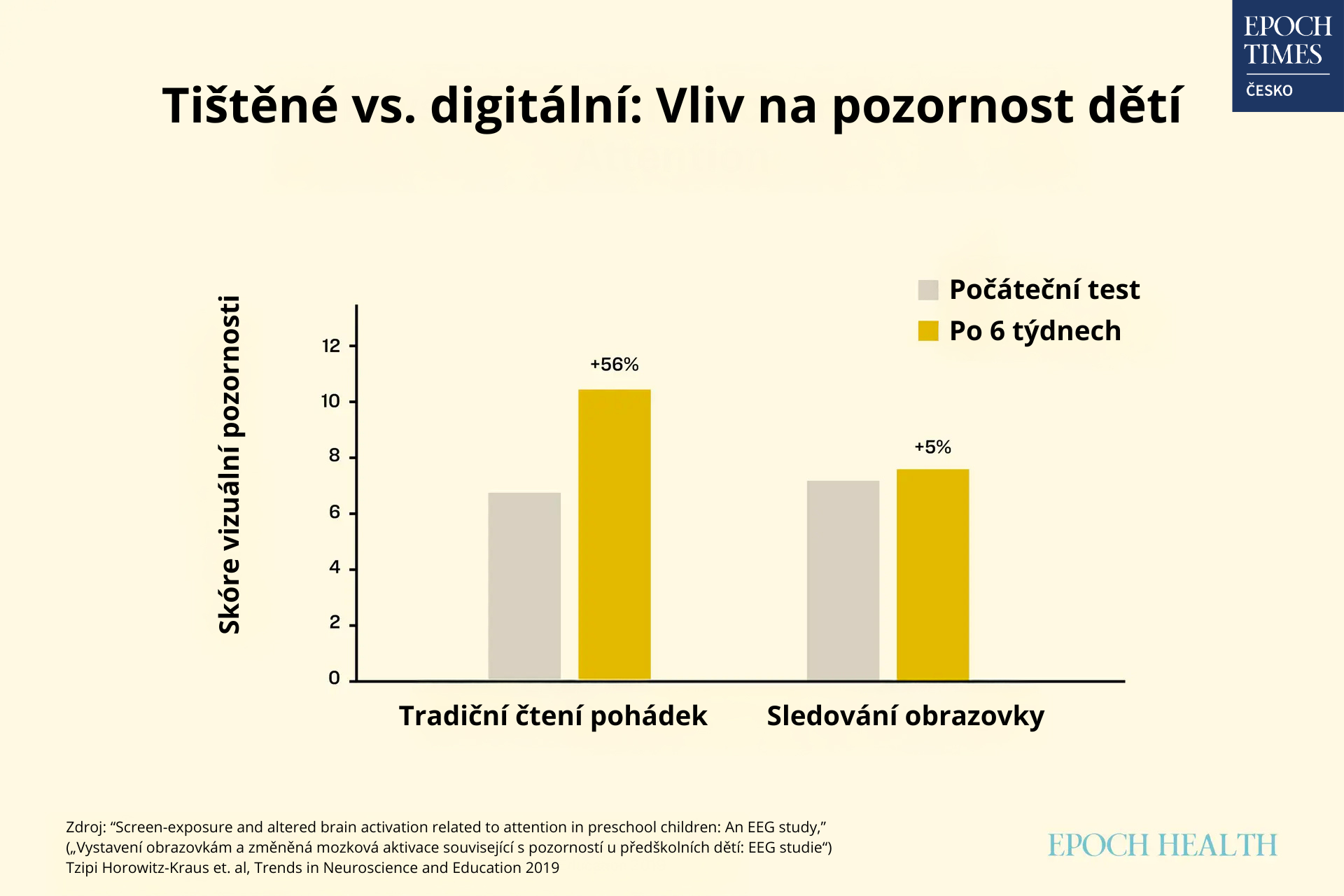 O šest týdnů později děti, které sledovaly čtení na obrazovce, dosahovaly výrazně horších výsledků v testech pozornosti a jejich mozkové vlny vykazovaly změny podobné těm, které se objevují u dětí s ADHD. Čtení z obrazovek – dokonce i v takto nízkém věku – ztěžuje schopnost soustředit se na čtený obsah.