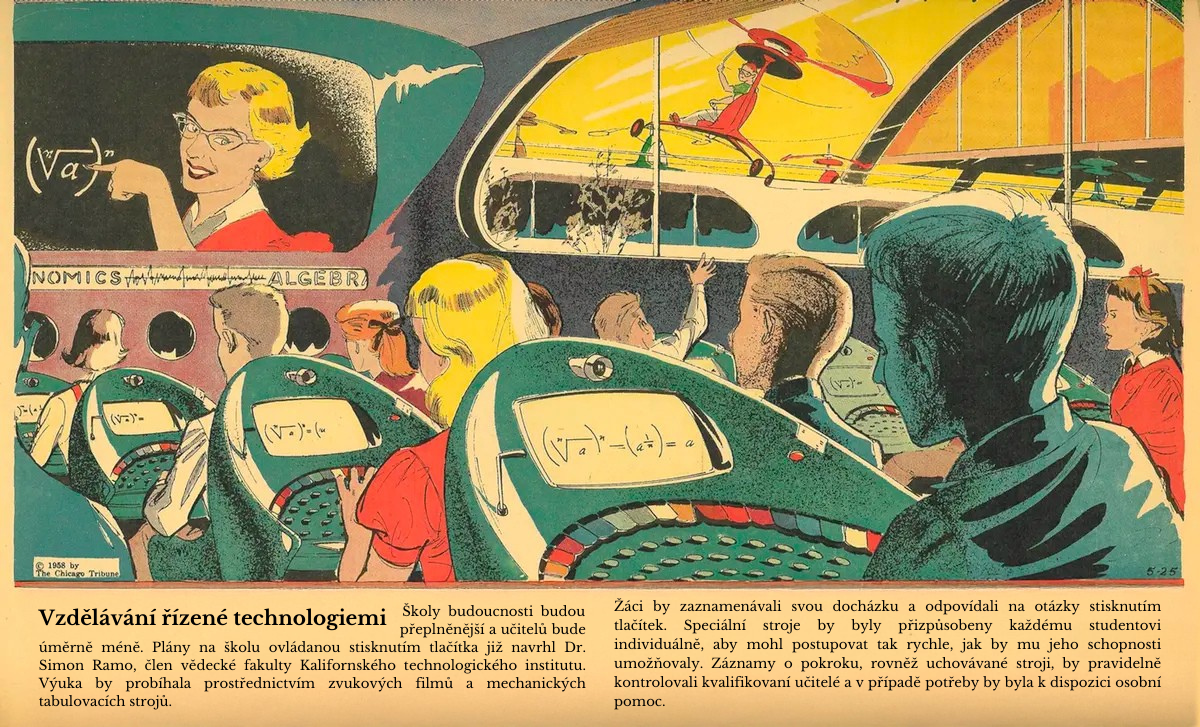 Ilustrátor Arthur Radebaugh si kdysi představoval budoucnost, v níž technologie přinese revoluci ve vzdělávání: učitelé budou digitalizováni, studenti se budou učit pouhým stisknutím tlačítka a obrazovky ovládnou školní třídy. V době, kdy tato proroctví vyslovil v 50. letech, se mohla jevit jako optimistická – dnešní realita je však složitější.