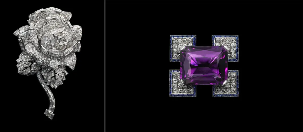 (Vlevo) Brož ve tvaru růže, 1938, Cartier London. Diamanty a platina. (Vpravo) Brož, 1933, Cartier London. Ametysty, safíry, diamanty a platina. Sbírka Cartier. (Vincent Wulveryck, Cartier Collection / © Cartier)