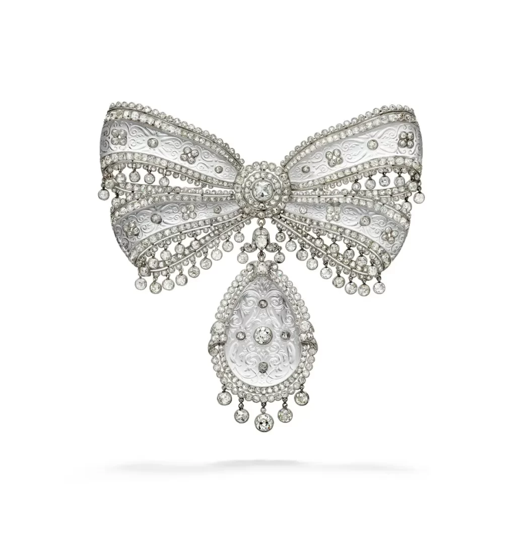Na výstavě bude k vidění velkolepý šperk z tohoto období, který si vyžádal nejvyšší míru řemeslného umění – brož na korzet z roku 1913. Je zhotovena z broušeného křišťálu, diamantů a platiny; plastická dvojitá mašle je zdobena rytým rostlinným ornamentem na křišťálu, jenž vytváří dojem krajky.