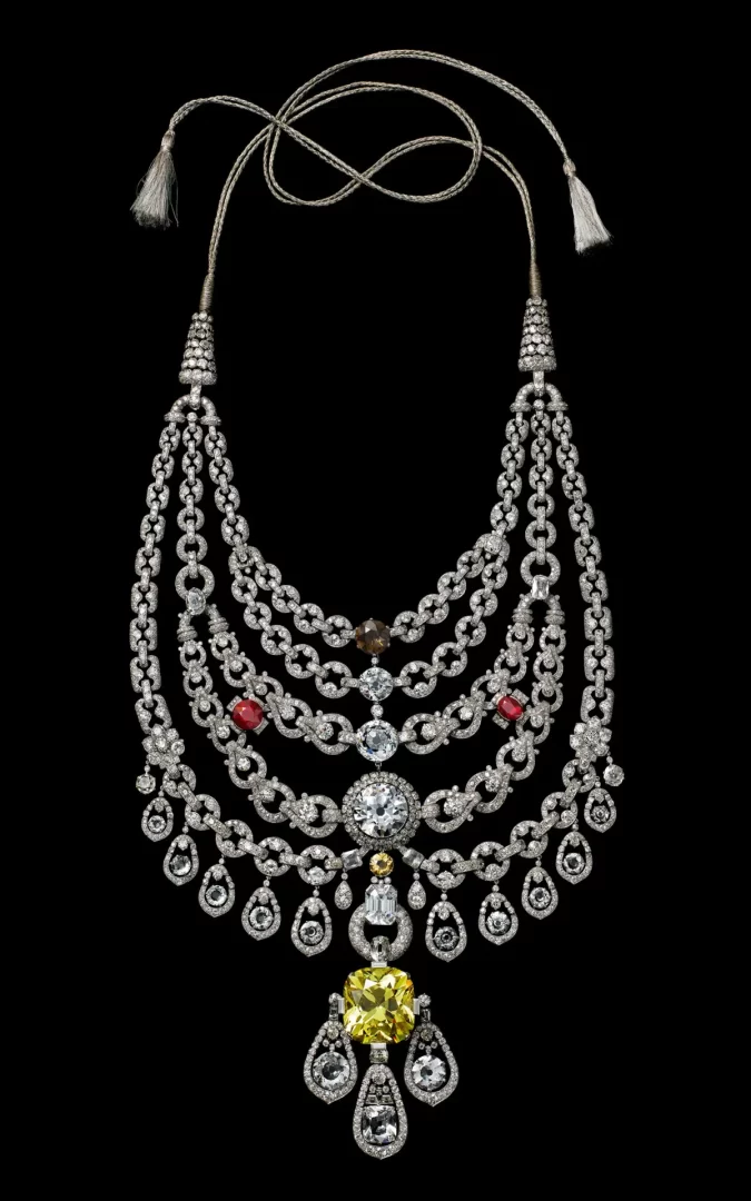 Náhrdelník Patiala, zakázka maharádži Bhupindera Singha z Patialy z roku 1928 (restaurován 1999–2002), Cartier Paris. Diamanty, žluté a bílé zirkony, topaz, syntetické rubíny, záhněda, citrín, platina. Sbírka Cartier. (Vincent Wulveryck, Cartier Collection / © Cartier)