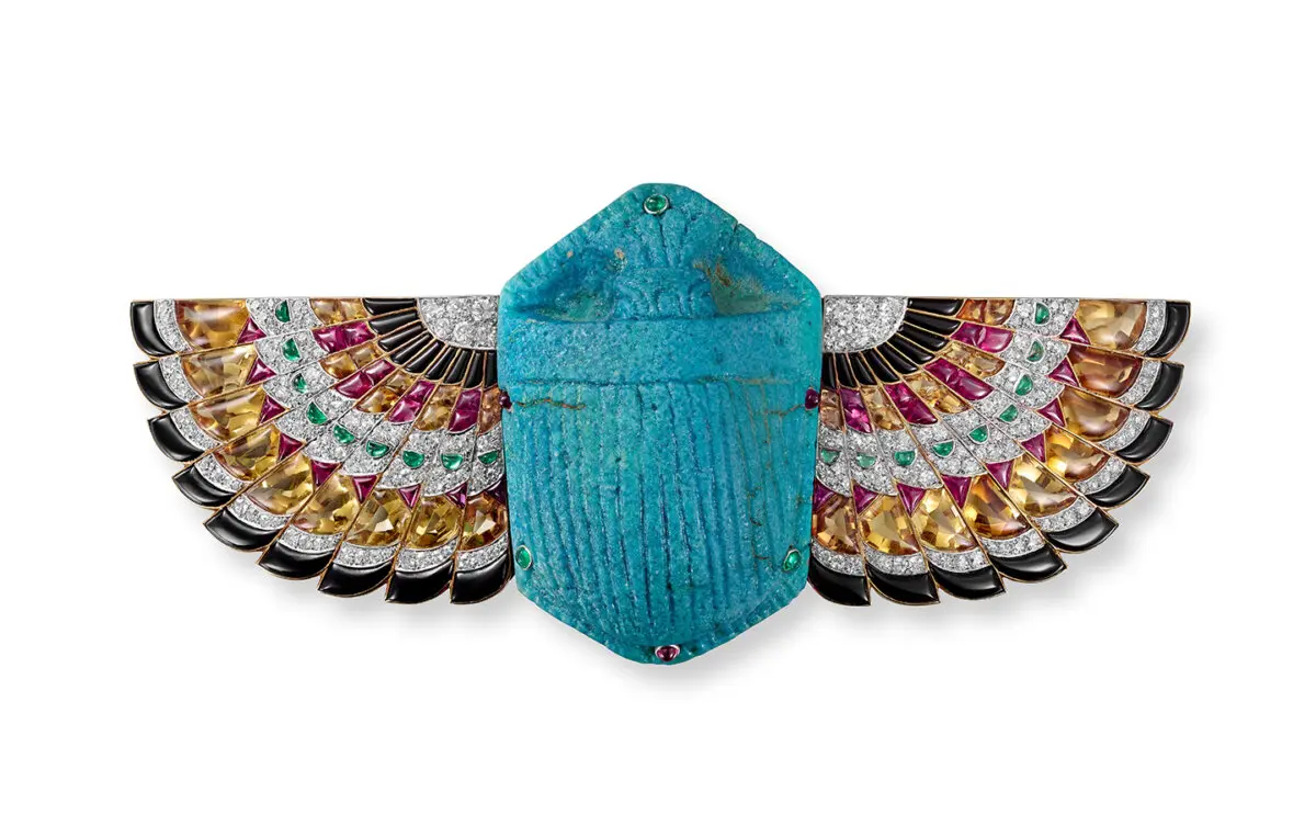 Cartier začlenil egyptské motivy do různých forem šperků – jedním z příkladů je „Brož skarabea“ z roku 1925, která je součástí výstavy. Ozdobena je tyrkysově modrou egyptskou fajánsí (keramickým materiálem ceněným už ve starověkém Egyptě) a drahokamy broušenými do přesných tvarů, tvořícími křídla. Skarab byl symbolem života, smrti, znovuzrození a nesmrtelnosti. Brož bylo možné nosit i jako přezku na pásek.