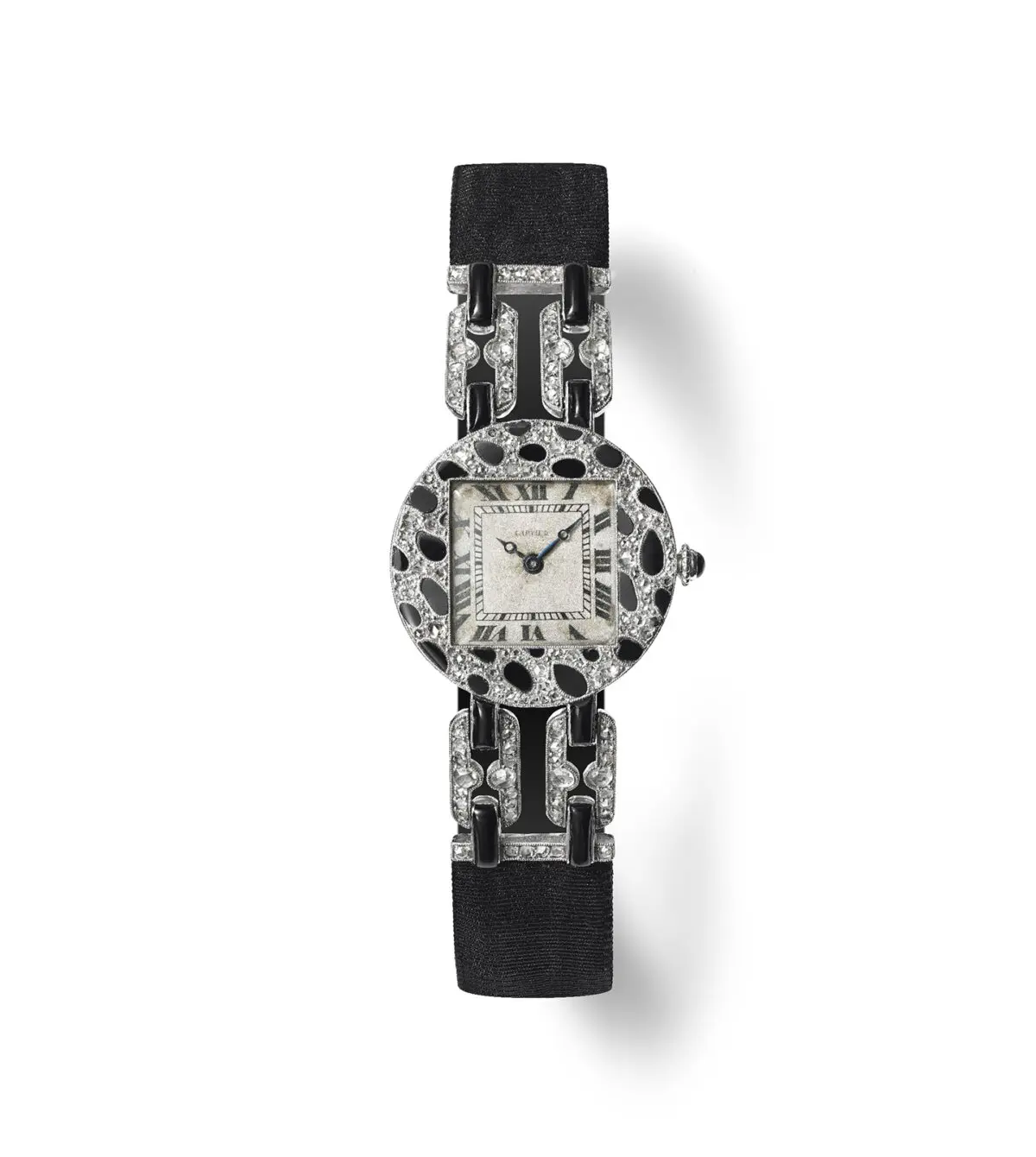 Náramkové hodinky s panteří kůží, 1914, Cartier Paris. Onyx, diamanty, růžové zlato, platina a černý moaré pásek. Sbírka Cartier. (Nils Herrmann, Cartier Collection / © Cartier)