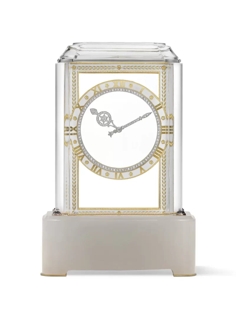 „Tajemné hodiny Model A“, 1914, Maurice Coüet pro Cartier Paris. Křišťál, achát, diamant, safír, email, zlato, platina, osmidenní stroj. Sbírka Cartier. (Nils Herrmann, Cartier Collection / © Cartier)