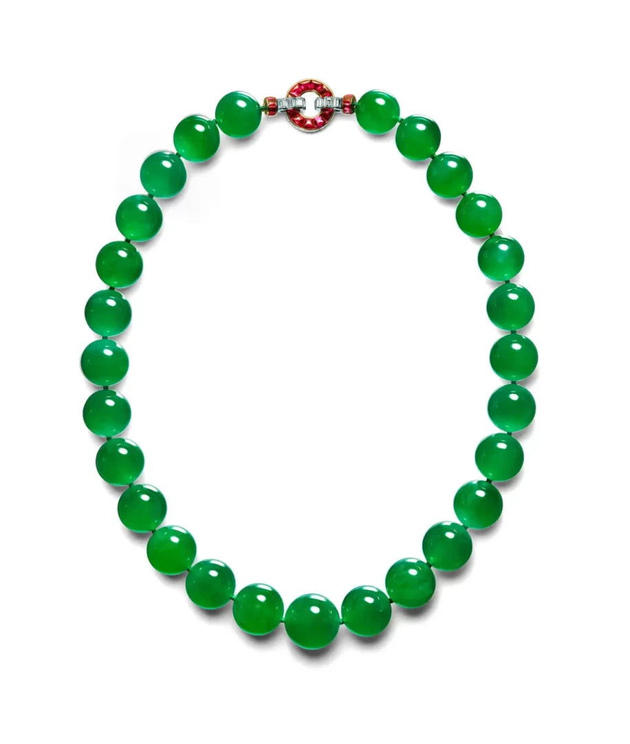 Náhrdelník z barmského jadeitu, který patřil americké dědičce Barbaře Huttonové, 1934, Cartier Paris. Jadeit, rubíny, diamanty, platina a zlato. (S laskavým svolením Cartieru)
