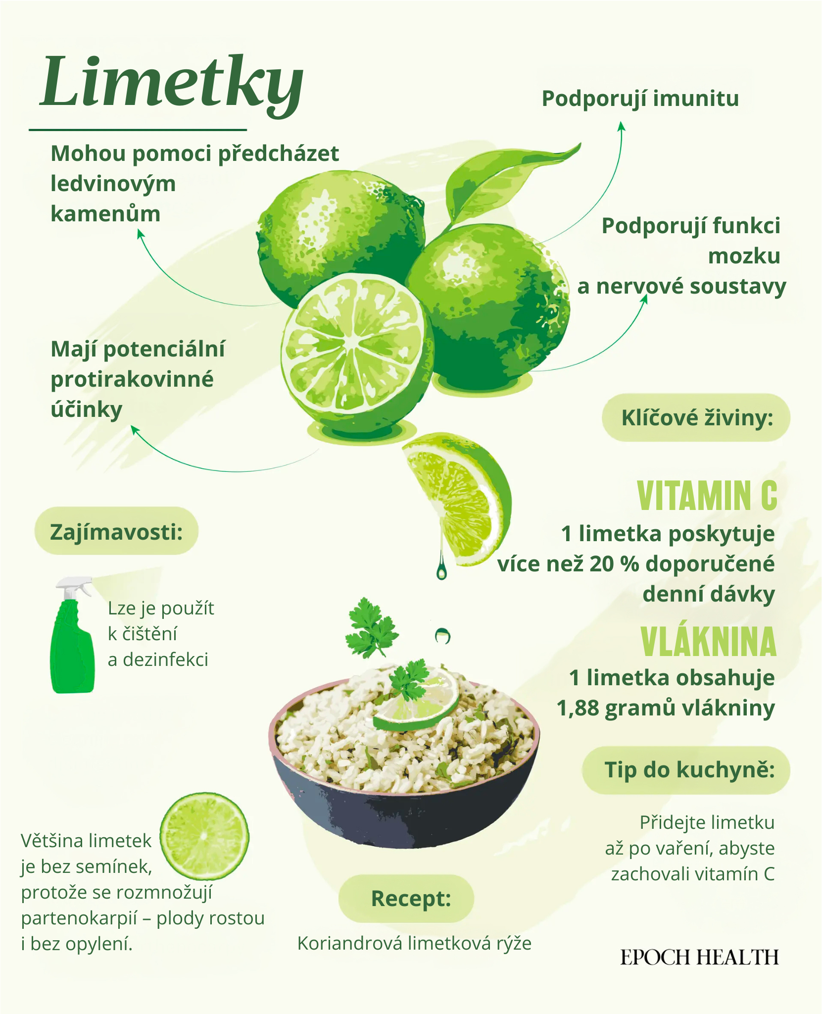 Limetky představují dokonalou rovnováhu mezi výraznou kyselostí a jemnou sladkostí. Jejich osvěžující chuť dokáže pozvednout každé jídlo – od salsy až po limetkový koláč. Limetky však nejsou jen kulinářskou pochoutkou – tyto všestranné plody nabízejí řadu zdravotních přínosů: od prevence ledvinových kamenů díky obsahu kyseliny citronové až po podporu mozku a nervového systému.