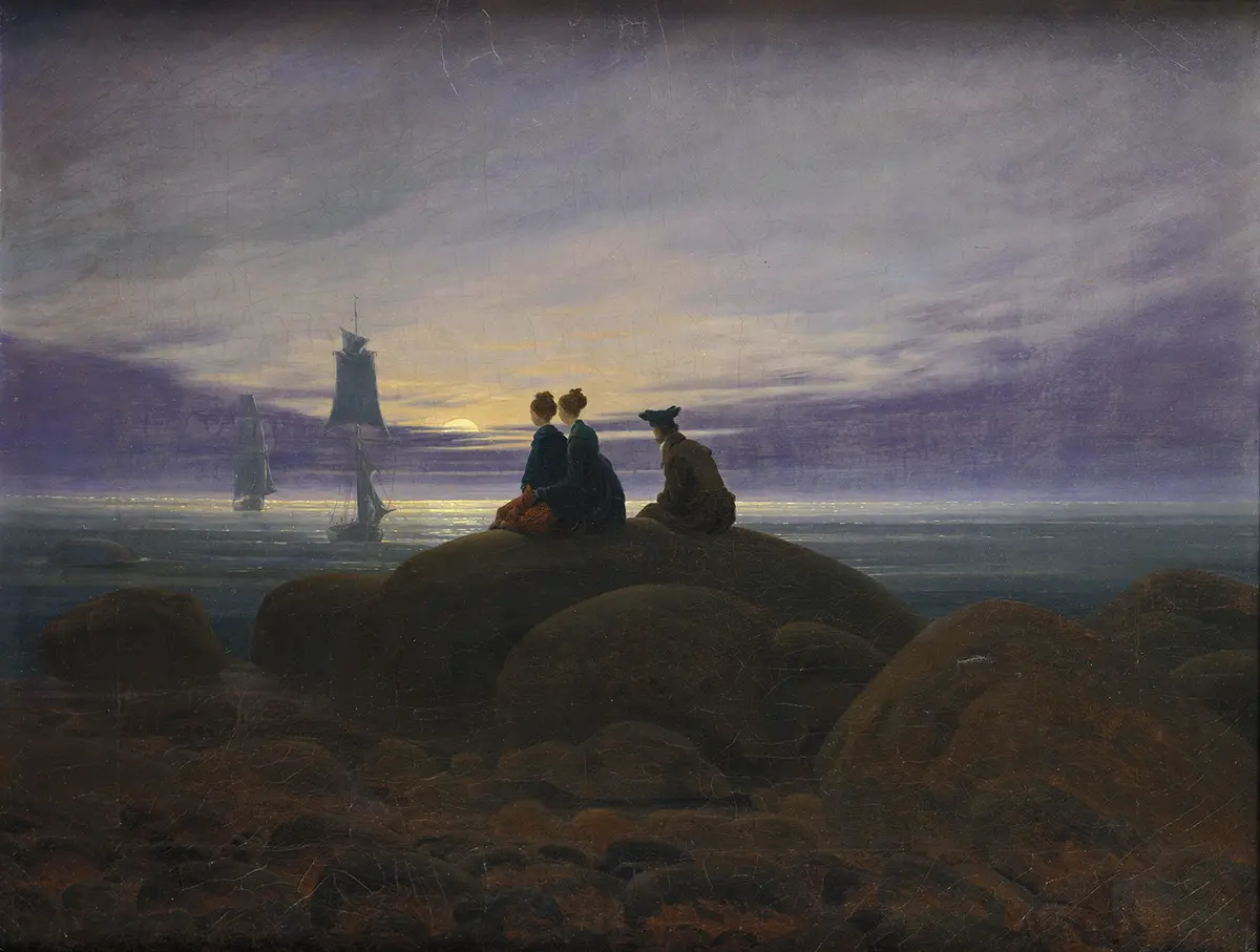 Umělec vytvořil trojici obrazů, na nichž jsou dva lidé v měsíčním světle. Na výstavě je vystaven obraz Dva muži rozjímající nad měsícem, který vlastní Metropolitní muzeum umění. Zatímco osamělé postavy jsou v jeho díle časté, některé obrazy obsahují figurální seskupení. Ostatně sám Friedrich byl velmi družný. Měl živou komunitu přátel umělců a ve svém ateliéru vítal svou ženu a děti. Obraz Dva muži rozjímající nad měsícem je jedním z jeho děl s více postavami a existuje hypotéza, že Friedrich může být jedním z mužů na obraze.