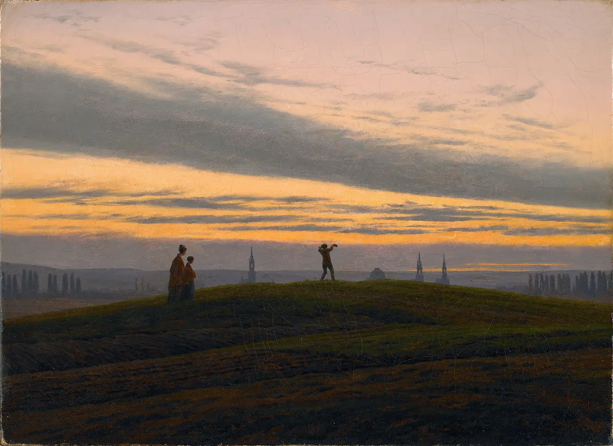 Nebeský motiv se prolíná celou Friedrichovou tvorbou, v některých jeho nejslavnějších dílech se objevuje Měsíc a večernice (jiný název pro planetu Venuši). Tato nebeská tělesa byla v období romantismu považována za symboly smrtelnosti, obnovy, osudu a naděje. Umožňují Friedrichovi experimentovat se světlem a liniemi horizontu a vytvářet nadpozemsky rozlehlé plochy.