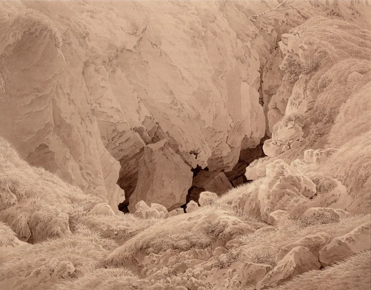 Pozoruhodným dílem na konci výstavy je Jeskyně v Harzu. Tato oslnivá kresba z přibližně roku 1837 zobrazuje něco, co by mohlo být starobylou pohřební komorou v Sasku. Témata smrtelnosti v závěrečných dílech Friedricha vrcholí. Až do konce experimentoval a v tomto díle nezahrnul oblohu ani horizont, ale spíše těsně oříznutou kompozici skalní stěny, což mu umožnilo zkoumat texturu, prostor a světlo.