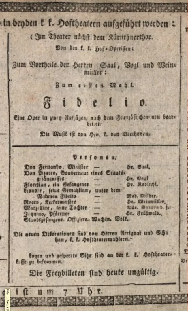 Fidelio měl premiéru ve Vídni v listopadu 1805 – krátce poté, co město obsadil Napoleon. Představení navštívilo jen málo Vídeňanů, publikum tvořili převážně francouzští vojáci, kteří umělecký záměr příliš neocenili. Po pouhých třech reprízách zklamaný Beethoven operu stáhl.