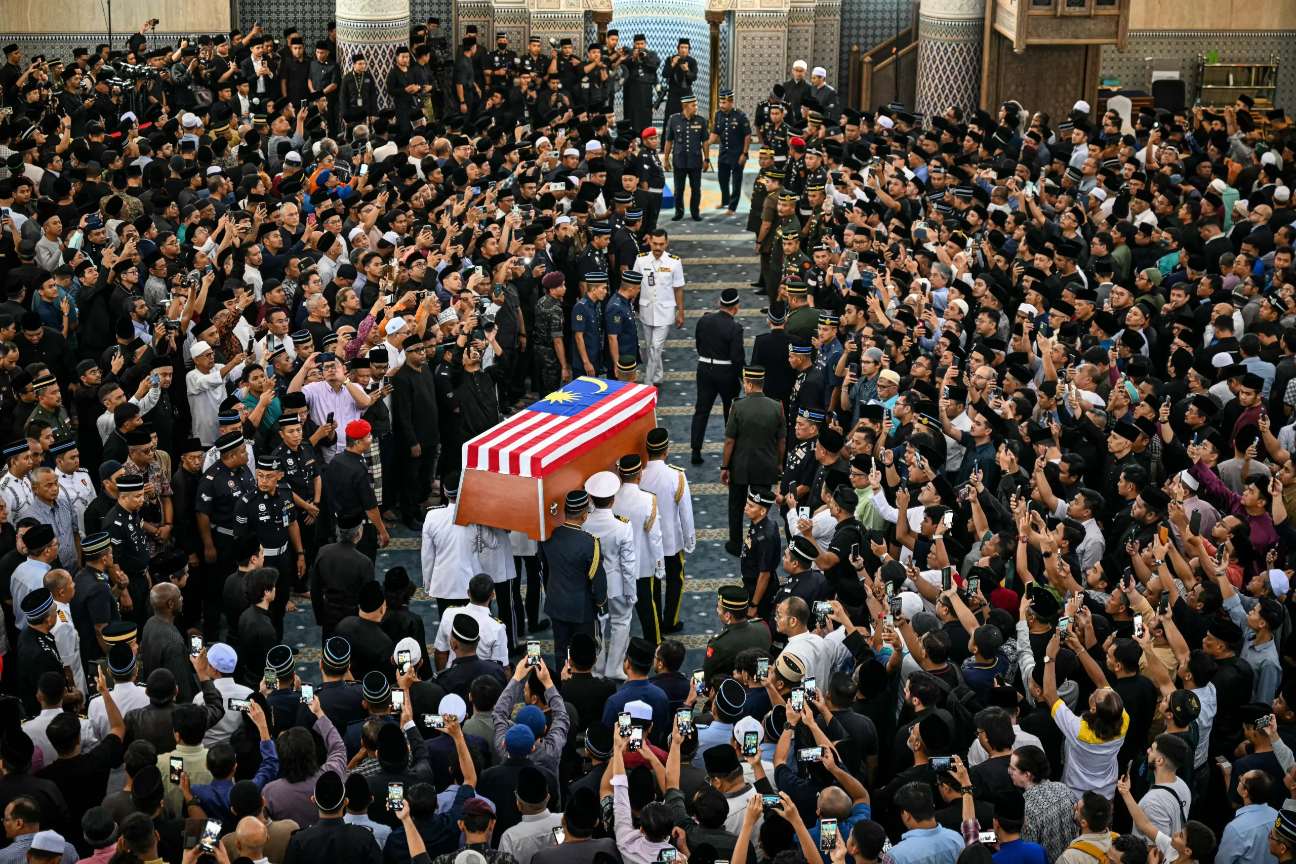 Lidé se fotografují a modlí, zatímco vojáci a policisté nesou rakev bývalého malajsijského premiéra Abdullaha Ahmada Badawiho před jeho pohřbem v Národní mešitě v Kuala Lumpuru 15. dubna 2025. Badawi zemřel 14. dubna ve věku 85 let. Mohd Rasfan/AFP via Getty Images