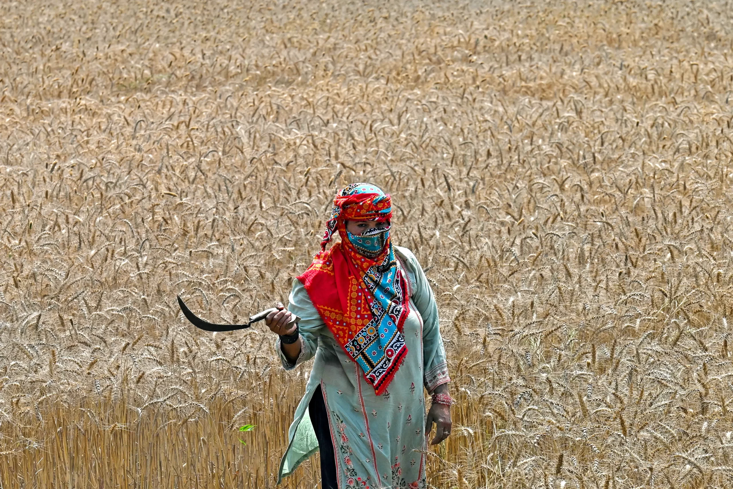 Farmářka sklízí pšenici na poli na předměstí pákistánského Láhauru 15. dubna 2025. Arif Ali/AFP prostřednictvím Getty Images