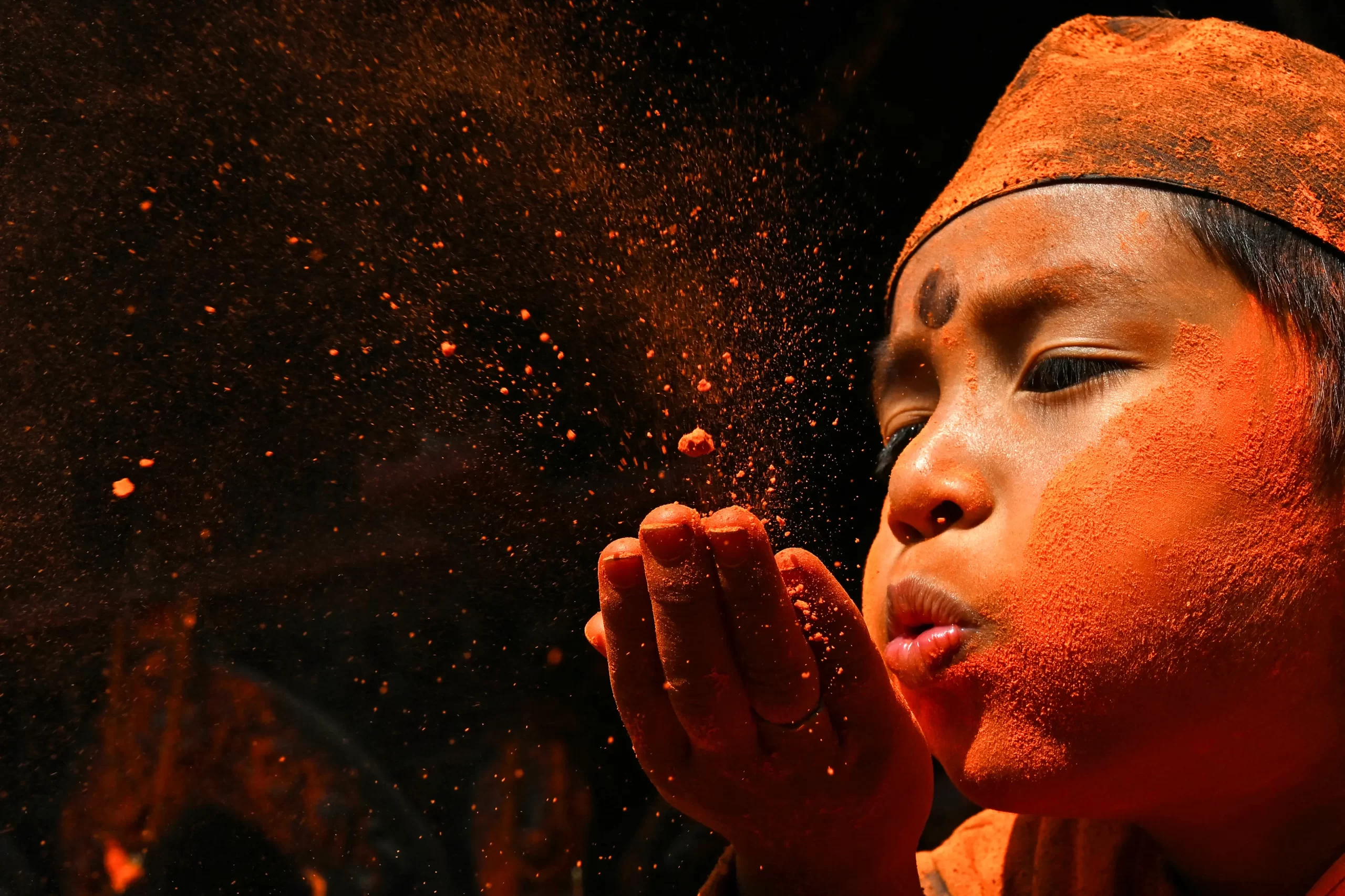 Účastník oslavy potřený vermilionovým práškem slaví „Bisket Jatra“, festival, který připomíná nepálský Nový rok, v Thimi na předměstí Káthmándú 15. dubna 2025. Prakash Mathema/AFP via Getty Images