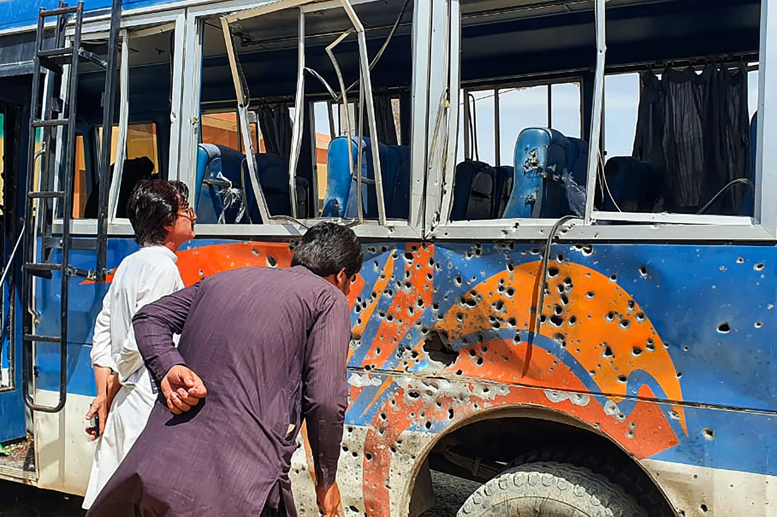 Lidé si prohlížejí poškozený policejní autobus zaparkovaný v bezpečnostním areálu po výbuchu bomby v Mastungu v jihozápadní pákistánské provincii Balúčistán 15. dubna 2025. Výbuch zabil nejméně tři policisty a 16 dalších zranil, uvedly úřady. STR/AFP prostřednictvím Getty Images